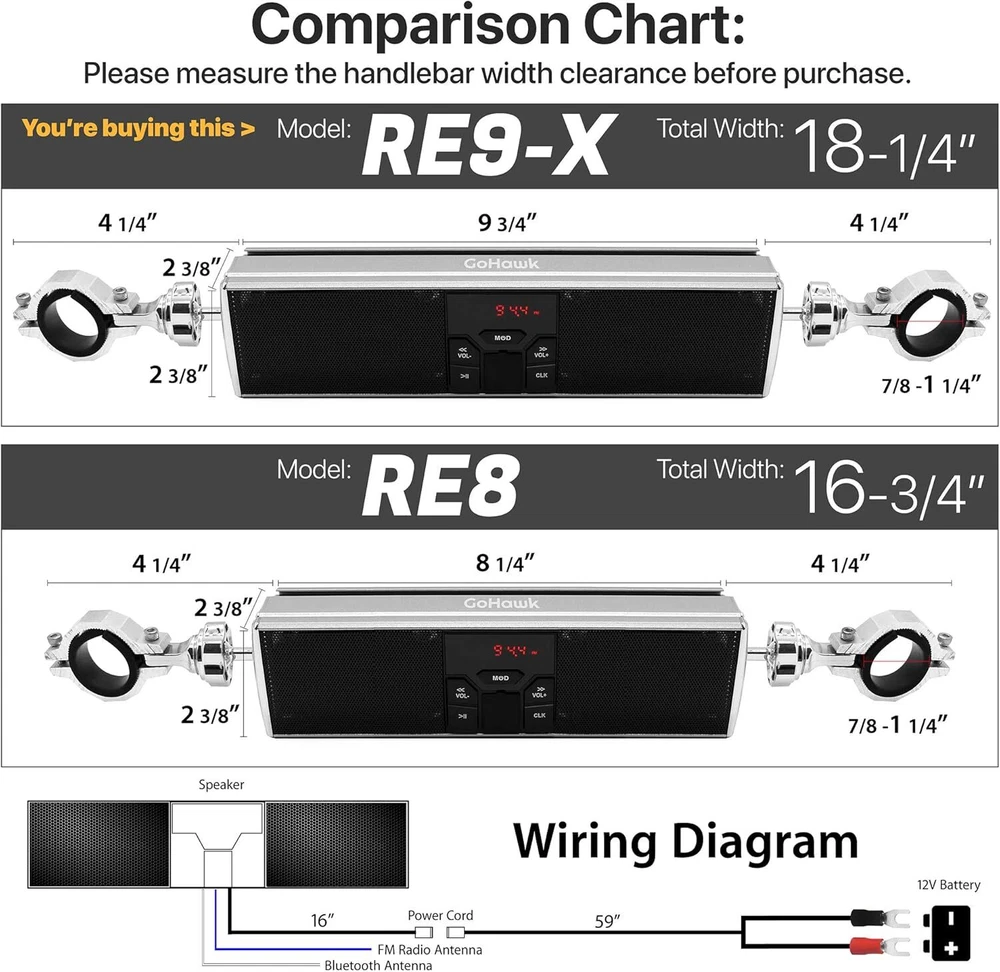 =============================================================== =============================================================== 1) Bluetooth Wireless 2) 24 White LEDs Strip 3) USB 2.0 4) AUX-IN 5) FM Radio 6) Display with Clock Cover: 87.5 - 108 MHz Sensitivity: ≤37dB Distortion: ≤0.5% SNR: ≥40dB LED Color: White Body Color: Silver Side Plate Color: Chrome Mounting Clamp Color: Silver Rated Voltage: 12V DC Max Input Power: 12W x 2 Rated impedance: 4 - 8Ω Bluetooth Ver.: 4.0 Bluetooth Protocol: AVRVP1.0, GAVDP1.0, ADVTP1.0, A2DP1.0 Wireless transmission range > 15m Frequency range:20Hz - 20KHz 3.5mm Audio Jack: No AUX-IN: 3.5mm USB: Support USB Drive in mp3 format USB Charging: No Dimensions: Speaker Width(Body): 9-3/4 in. Speaker Width(Overall): 18-1/4 in. Handlebar Clamp Size: 7/8 to 1-1/4 in. 1 x Speaker Stereo Main Unit 2 x Mounting Clamp 1 x Power Harness 1 x User Manual GoHawk's motorcycle soundbar speaker features an innovative mounting design with a new ball stub design and mounting clamp that supports 7/8" to 1 1/4" handlebars. The 360-degree swivel-able feature allows for custom installation, and the speaker comes with a 59" battery cable harness with a ring terminal connector, making it easy to install. The GoHawk RE9-X model has an overall width of 18-1/4" and is compatible with most motorcycles, ATVs, UTVs, 4-wheelers, go-karts, and golf karts. Before purchase, make sure to measure your handlebar center clearance. If you have a smaller handlebar clearance, consider the RE8 model with an overall width of 16-3/4". GoHawk's dual waterproof motorcycle stereo speakers come with a high-performance power amplifier built-in and 24 white LED strips that can be turned on and off with one click. The speaker clamp has a universal fit for 7/8" to 1 1/4" handlebars, and the aluminum stereo main unit has a satin finish and a digital display for easy use. This motorcycle speaker has Bluetooth wireless capabilities that allow you to stream your favorite music and radio channels from your smartphone. It is compatible with a wide range of devices, including iPhone, iPod, Samsung Android Galaxy S Note series, and any smartphone devices. It also supports USB MP3 files, FM radio, and has a clock display. Enjoy superb crystal sound quality with this advanced waterproof motorcycle speaker designed for 12V applications. The satin-finished stereo unit is built with high-quality aluminum material and is perfect for outdoor use. It's easy to install with all necessary hardware and wiring included, and it comes with a standard 12V power connection for plug-and-play convenience. Brand GoHawk Model Name RE9 X Speaker Type Outdoor, Soundbar Connectivity Technology Bluetooth, Auxiliary, USB Special Feature Waterproof 5961861
