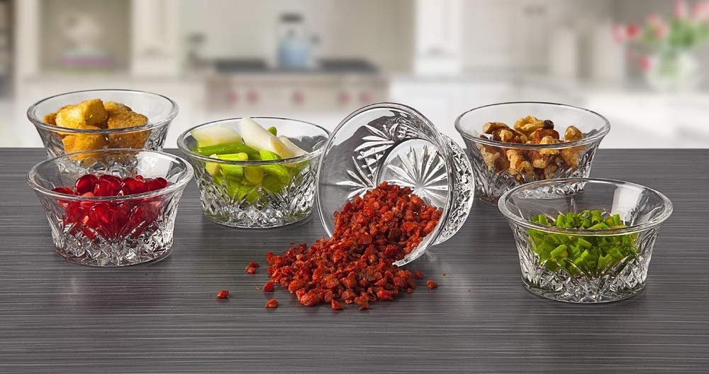 Godinger Bowl Set - Mini Crystal Prep, Dip, Dessert, Bar Dish Bowls - Set of 6, 2oz Dublin collection lead free crystal glass stackable mini 2oz bowl set. Use as prep pinch bowls for cooking or as dessert, dip or snack bowl. Glass will not absorb liquids, colors or flavors. Lead Free. Capacity: 2oz Since 1973 Godinger has specialized in handcrafted silver, pewter, crystal, stainless, and alternative metal giftware. From wedding gifts, candlesticks, barware, bakeware, tea sets and frames, you are sure to find the perfect item for any special occasion. Godinger products are available at all major retailers across the US and Canada.