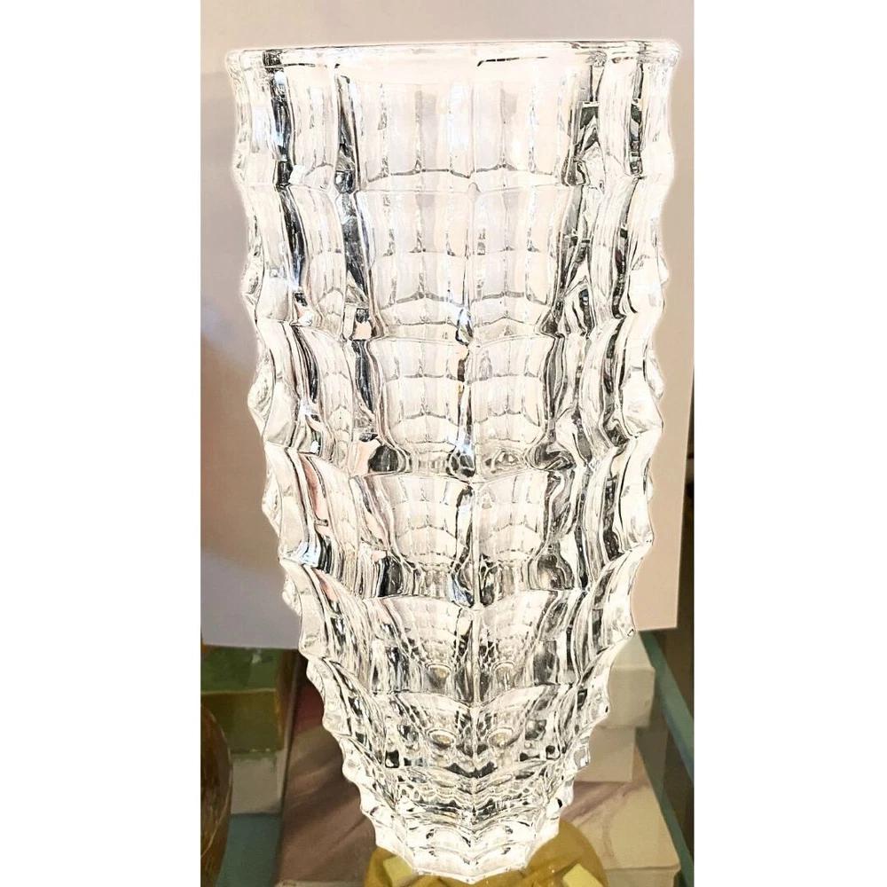 This is a large round crystal vase by Godinger in the "In the Window" pattern. It features a contemporary style with a geometric pattern and textured finish. The vase is waterproof and suitable for indoor use. It is adorned with crystals and has a clear color. This 6.8-inch tall vase is designed for all occasions and is perfect for adult use. It weighs 6 pounds and is part of the 21st Century era. No cracks, or scratching, but there are two minor chips on the bottom of the vase which are pictured in this listing. Please see the photos for visuals.
