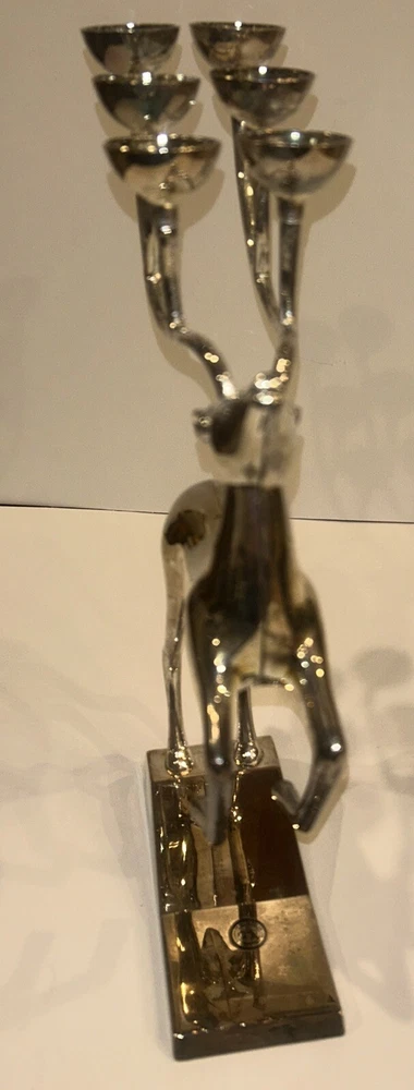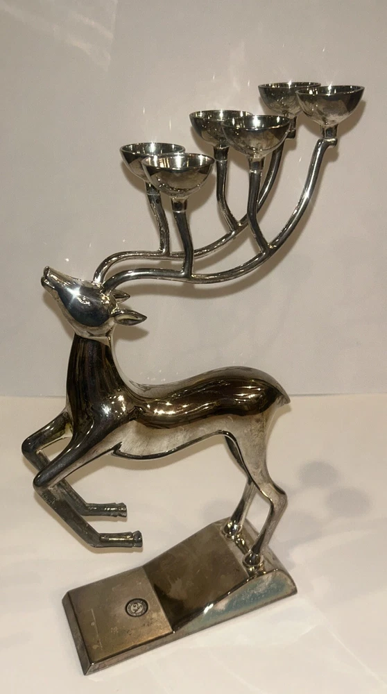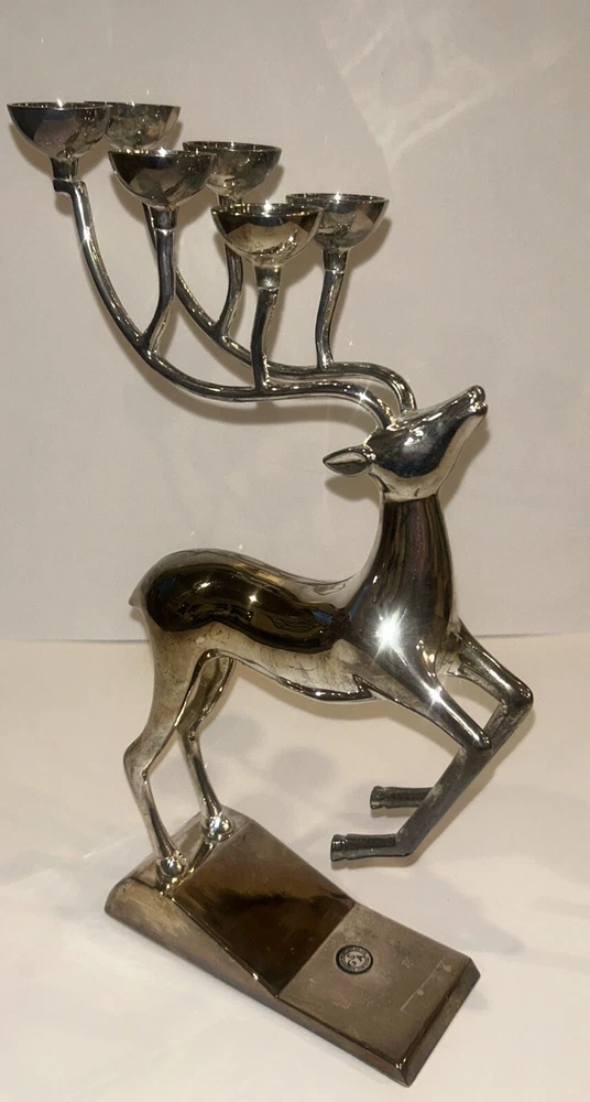 Add a touch of rustic charm to your Christmas decor with this Godinger Silver Plated Reindeer Candle Holder. With its intricate antler design and leaping reindeer subject, this candle holder is perfect for adding a festive and animalistic touch to your home. Measuring at 12 inches in height and width, this medium-sized candle holder is suitable for use with cups and is made of durable aluminum and silver-plated materials. Celebrate the season and bring a little bit of the outdoors into your living space with this beautiful and timeless piece. Suitable for adults and collectors alike, this candle holder is perfect for creating a warm and welcoming atmosphere in any room. With its silver color and deer shape, this Godinger candle holder is sure to be a cherished addition to your Christmas collection. kk39