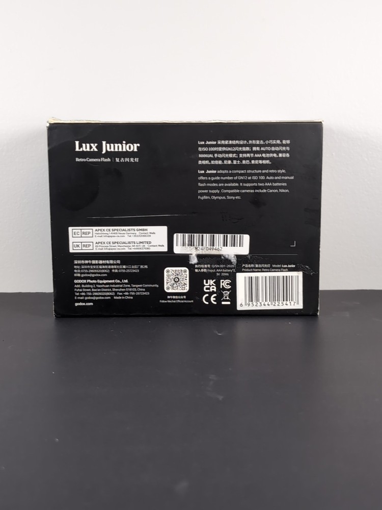 gtin13: 6952344225417 Mount Interface: Hot Shoe Country/Region of Manufacture: China Type: Retro Camera Flash Model: Lux Junior Retro Brand: Godox UPC: 6952344225417 Compatible Brand: Universal, For Canon, For Fujifilm, For Nikon, For Olympus, For Sony To Fit: Camera