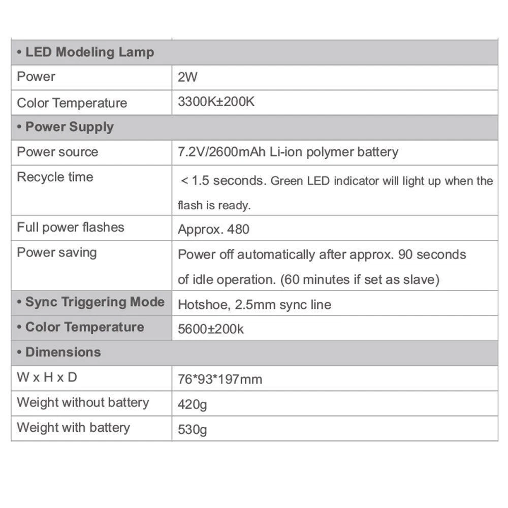 Guide Number: 60 m MPN: Does Not Apply To Fit: Digital Camera Mount Interface: Hot Shoe Brand: Godox Bundle Description: Case UPC: Does not apply Features: AF Assist Light Compatible Series: SONY Light Type: Xenon Country of Origin: China Custom Bundle: Yes Manufacturer Warranty: 1 Year Type: Flash Gun gtin13: Does not apply Compatible Brand: For Sony Model: V1C