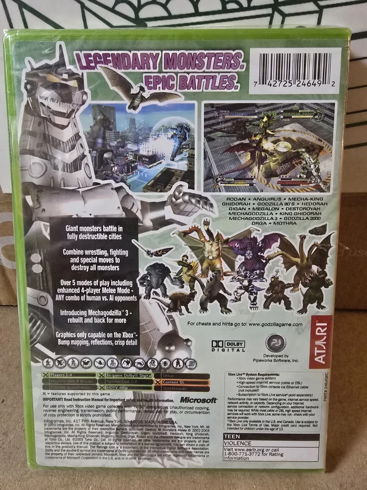 Xbox-specific features include the addition of Mechagodzilla 3, two new arenas, computer-controlled combatants in both four-player melee and team games, and an option to play Destruction Mode alone. New arenas consist of the Vortaak Home World and a giant Boxing Ring. The former features volcanoes, alien structures, spaceship launchers, and more, while the latter offers ropes, bells, and blimps in what is described as the "largest boxing ring in the world constructed for monster battles." Other enhancements include upgraded visuals with bump-mapping, high-resolution textures, and other special effects, as well as support for custom soundtracks.Platform:Microsoft XboxCountry/Region of Manufacture:USARating:T-TeenESRB Descriptor:ViolenceGenre:FightingGame Name:Godzilla: Destroy All Monsters MeleeMPN:742725246492UPC:0742725246492Control Elements:Gamepad/JoystickNumber of Players:1-4Release Year:2003