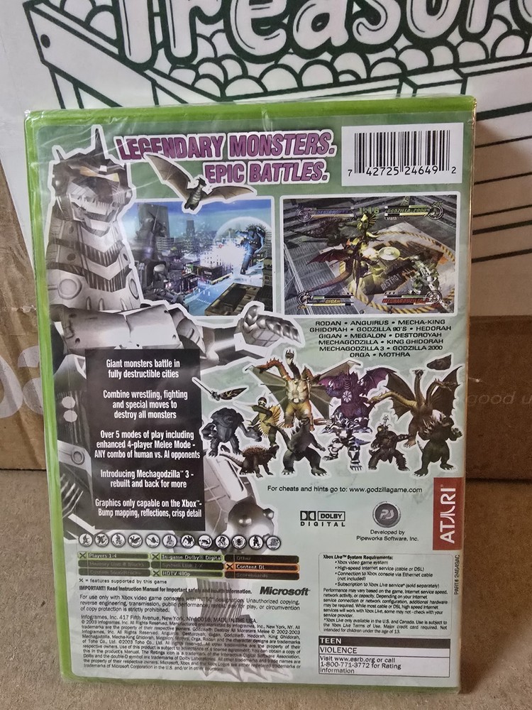 gtin13:0742725246492_desc_:After conquering the GameCube, Godzilla lumbers onto the Xbox in a four-player 3D brawler starring over 14 monsters from Toho Co. Ltd.'s famous movie series. Godzilla is pitted against such enemies as Mothra, King Ghidora, Mechagodzilla, and more as they fight amidst the chaos of Tokyo, San Francisco, Seattle, Monster Island, and six more environments. Populated regions will send out armies in an attempt to prevent their cities from being ravaged by the hulking beasts.