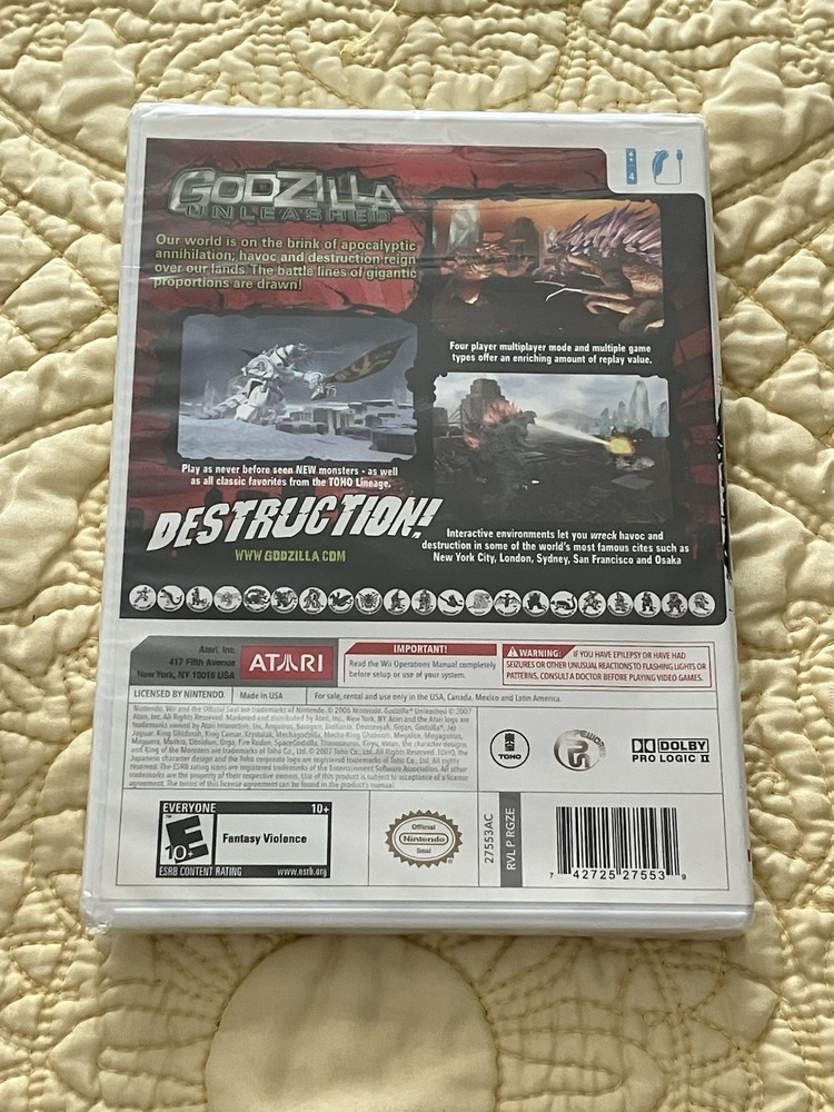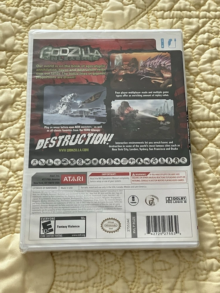 _desc_:"Godzilla: Unleashed" for the Nintendo Wii is a fighting game on a colossal scale. Go ahead and unleash citywide damage with one of the 23 monsters available, including two Toho monsters that are entirely new for the game. Use a wide assortment of moves, including breath attacks, somersaults, and tail whips to destroy everything in sight. In addition to destroying things, players get to make and break alliances throughout the storyline and choose whether to gather an army or go it solo. For real multiplayer mayhem, party modes support up to four players for fierce social battles. Build up a critical mass meter in order to increase your monster's size and power for a limited time.Number of Players:1-4MPN:742725275539ESRB Descriptor:Fantasy ViolenceCountry/Region of Manufacture:USARelease Year:2007Platform:Nintendo WiiControl Elements:Gamepad/Joystickgtin13:0742725275539Publisher:Atari Inc.UPC:0742725275539brand:Atari Inc.Rating:E10+ (Everyone 10+)Genre:Action & AdventureGame Name:Godzilla: Unleashed