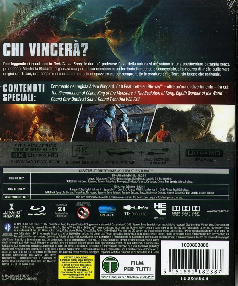 Further Details Title: Godzilla Vs Kong (4K Ultra-HD+Blu-Ray) Condition: New Description: DESCRIZIONE PRODOTTO SINOSSI Due leggende si scontrano in “Godzilla vs. Kong”: questi mitici avversari si affronteranno infatti in una spettacolare battaglia senza precedenti, con il destino del mondo in bilico. Kong e i suoi protettori intraprenderanno un viaggio pericoloso per trovare la sua vera casa, e con loro c’è Jia, una giovane ragazza orfana con la quale ha stretto un legame forte ed unico. Ma si troveranno inaspettatamente sul cammino di un Godzilla infuriato, che sta seminando distruzione in tutto il mondo. L’epico scontro tra i due titani, istigato da forze invisibili, è solo l’inizio del mistero che giace nel profondo della Terra. Format: 4K UHD Blu-ray EAN: 5051891182387 Type: Film Actor: Alexander Skarsgård, Millie Bobby Brown, Rebecca Hall, Brian Tyree Henry, Shun Oguri No Of Discs: 2 Country/Region of Manufacture: Italia Studio: Wb Language: Inglese, Italian Missing Information? Please contact us if any details are missing and where possible we will add the information to our listing.