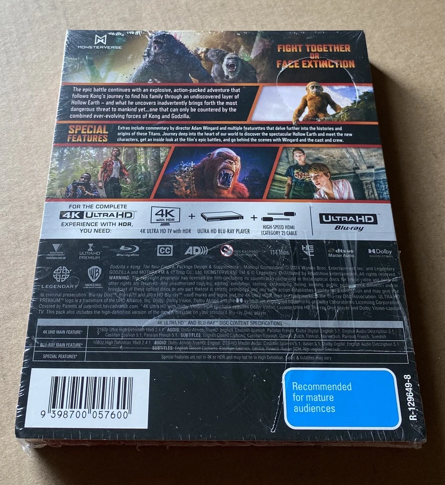 Immerse yourself in the epic battle between Godzilla and King Kong with this limited edition steelbook of "Godzilla x Kong: The New Empire." Directed by Adam Wingard, this action-packed film is presented in stunning 4K UHD Blu-ray format with a Blu-ray: Region Free region code. Join Rebecca Hall, Brian Tyree Henry, and Dan Stevens as they navigate a world of creatures and monsters, with special features like commentary and behind-the-scenes featurettes adding to the thrill of this collector's edition. Don't miss out on this rare opportunity to own a piece of cinematic history from Warner Home Video, perfect for fans of adventure, sci-fi, and fantasy genres. BRAND NEW & SEALED*** TRACK POSTED*** INTERNATIONAL BUYERS WELCOMED*** FREE POSTAGE WITHIN AUSTRALIA*** Seal is not perfect,has holes and some tape, however it’s brand new and never been opened.