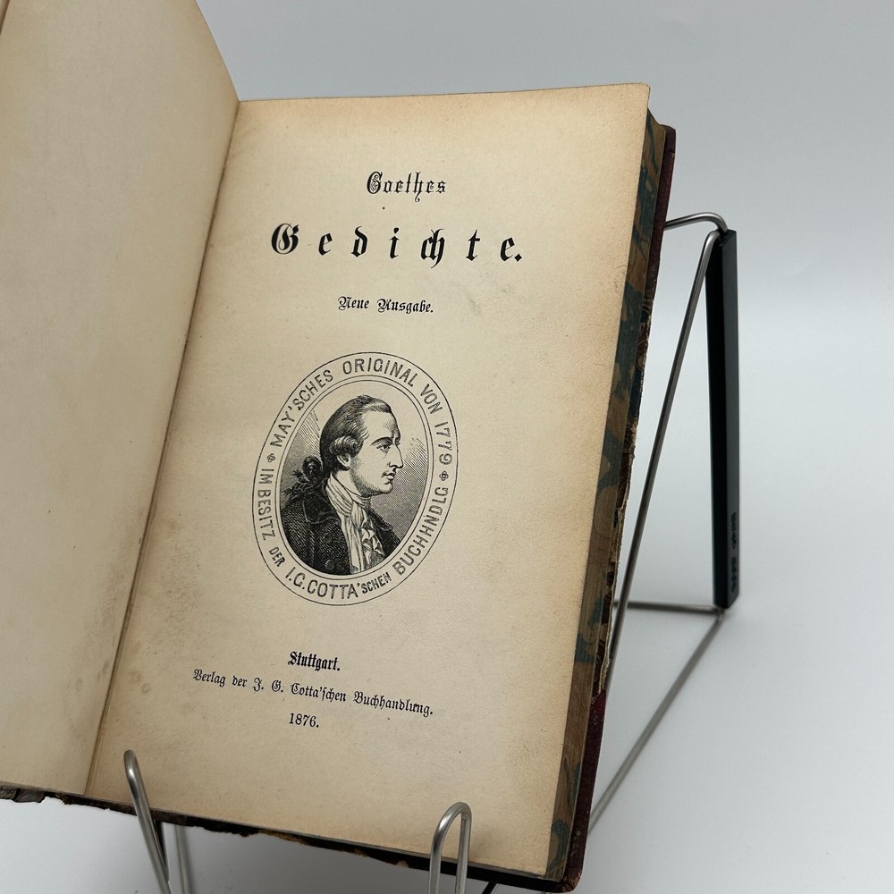 Delve into the poetic genius of Johann Wolfgang von Goethe with this 1876 edition of Goethe's Gedichte . Published by J. G. Cotta'sche Buchhandlung, this German-language volume is a Neue Ausgabe (New Edition) and features Goethe's timeless poetry. Bound in half-leather with marbled boards, this rare collectible shows wear from its long history but remains an essential addition to any collection of German literature. Don’t miss the chance to own this historic literary treasure!