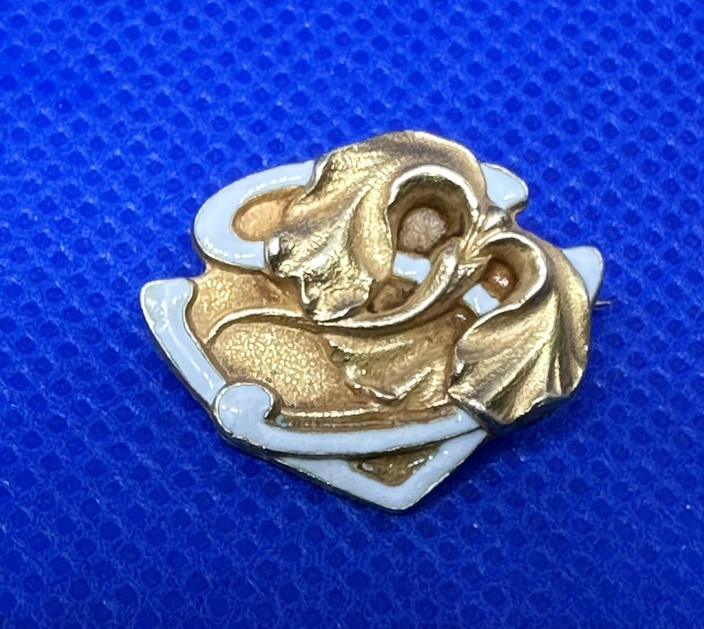 This stunning vintage pin from Bippart & Co. is a beautiful example of Art Nouveau style. The intricate iris design is made of yellow gold with enamel detailing, giving it a unique and eye-catching look. The pin is perfect for any occasion and would make a great addition to any jewelry collection. The languid curves and stylized floral motif of this pin are classic Art Nouveau. Made by Bippart & Co. of Newark, NJ, this brooch displays many of the hallmarks of fine artistry and craftsmanship that made Bippart a renowned jewelry manufacturer around the turn of the last century. Fashioned of a buttery yellow gold and textured to add a dramatic effect, the stylized iris motif is accented by whimsical colored enamel With a metal purity of 14k this pin is a high-quality piece of fine jewelry. It is not signed and is an original, vintage piece. The theme of flowers and plants adds to its charm and makes it a timeless piece that will never go out of style. Total weight. 4 grams.