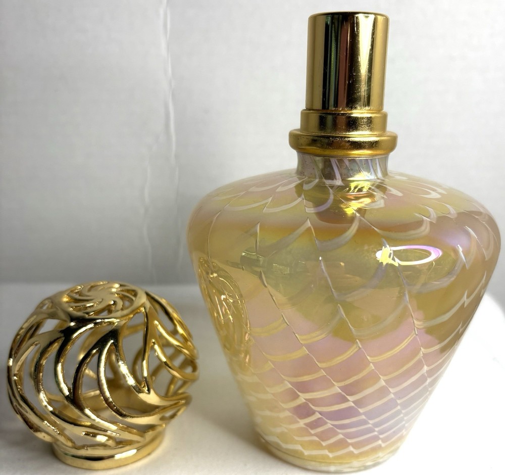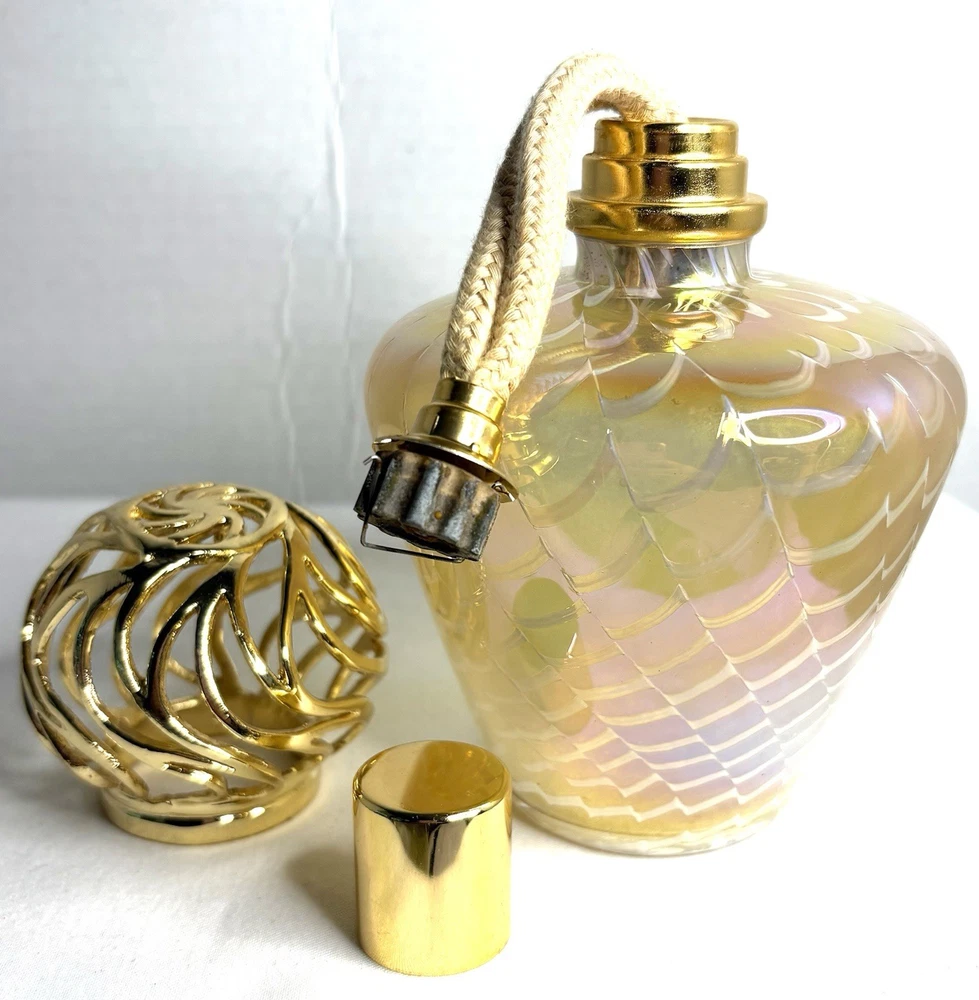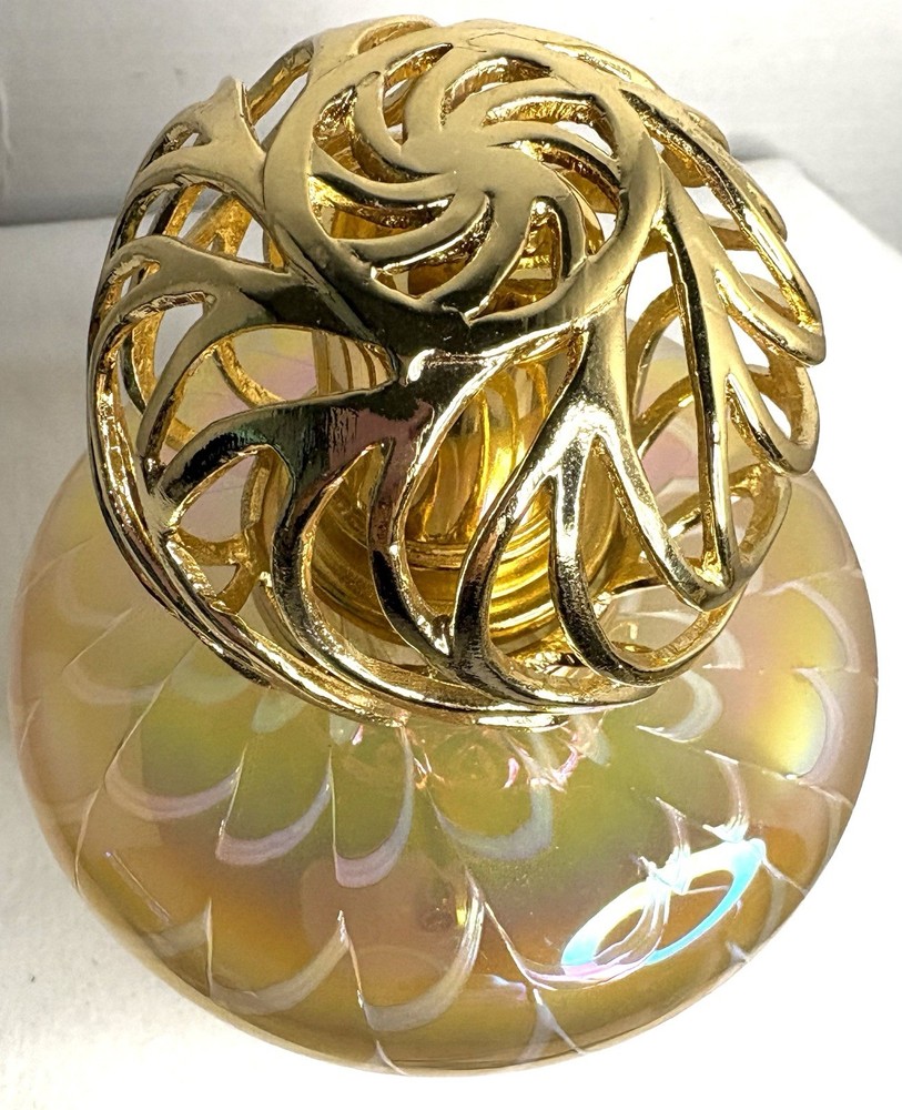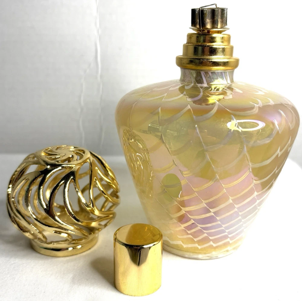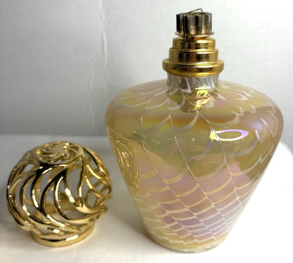 Elevate the ambiance of any room with this exquisite Gold and White Iridescent Swirl Art Glass Wick Fragrance Oil Diffuser Burner. Its medium size is perfect for placing on a shelf, desk, or nightstand, and the 4" diameter provides a substantial presence that complements its alluring pattern. The oil diffuser is designed to fill your space with your favorite aromas, promoting a sense of well-being and tranquility. Crafted from high-quality glass, the diffuser features a golden hue that captures the light, adding a touch of elegance to your decor. Standing at 6 inches tall, it's an ideal addition for any setting, be it a personal workspace, living area, or bathroom. This single-pack diffuser is a simple yet sophisticated way to infuse your environment with your preferred scents, ensuring a pleasant and inviting atmosphere.