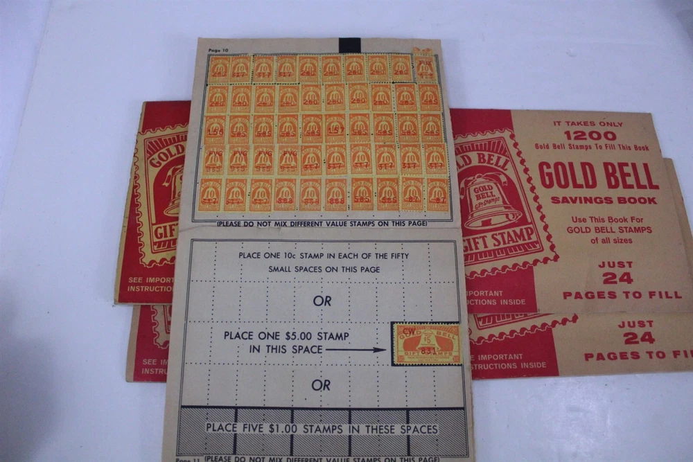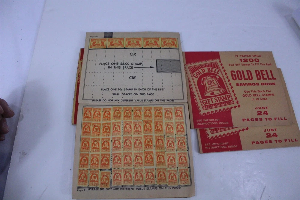 Gold Bell Gift Stamp Savings Stamps Books with Stamps Inside Vintage 3 full 1200 books, 1 partial and 1 empty We are committed to providing exceptional customer service, we will answer any questions you may have about our products as quickly as possible. We take care in taking photos to show condition, writing condition descriptions to best of our ability. If you feel we have missed something or your item arrives damaged from transit, please communicate with us and we will get it worked out to your satisfaction. You may be interested in our other eBay listings . - Powered by SixBit's eCommerce Solution