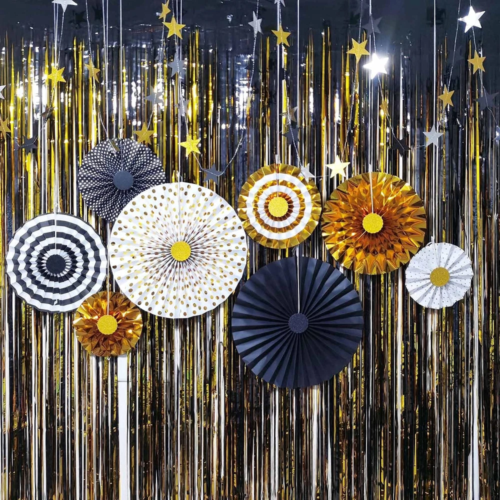 "When Black meets Gold Refinement and Luxurious" This item includes : 4 types of paper fans with different diameters about 16 in/12 in/10 in/8 in(40cm/30cm/25cm/20cm), and each type have double. These party decorations can be widely used for Wedding,Halloween,Happy new year, Happy Birthday, Carnival ,Welcome or Graduation Party and so on. They are degradable and can be reused multiple times. In order to avoid packaging damage during product transportation, we use transparent adhesive and self-adhesive packaging. Add to cart and get excitement into your party. ☆PAPER FANS Color: Gold/Black/White ☆Style characteristics:Dots / Rings / Foil / Specular Notice: -For transportation,we folded the fans to package.Please unfold the fans when you open the package and Paste the fan sides to each other.They are really beautiful. -In order to avoid packaging damage during product transportation, we use transparent adhesive and self-adhesive packaging after checking. -We can hang them to the wall/windows/ceiling by the thread or Fishing wire.They look Wonderful!!! -Look forward to your Satisfaction and Happy Feeling. If you have other questions please us and We are happy to assist you. Material : Paper Package includes : 2pcs x 16 in, 2pcs x 12 in, 2pcs x 10 in, 2pcs x 8 in Used for wedding/birthday/carnival/welcome/happy new year/graduation Party Decorations Colored on Both Sides-Gold Black and White;Design:Foil/dots/stripe/rings Degradable and can be reused multiple times;DIY