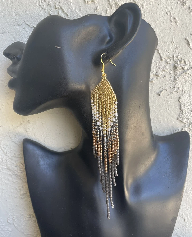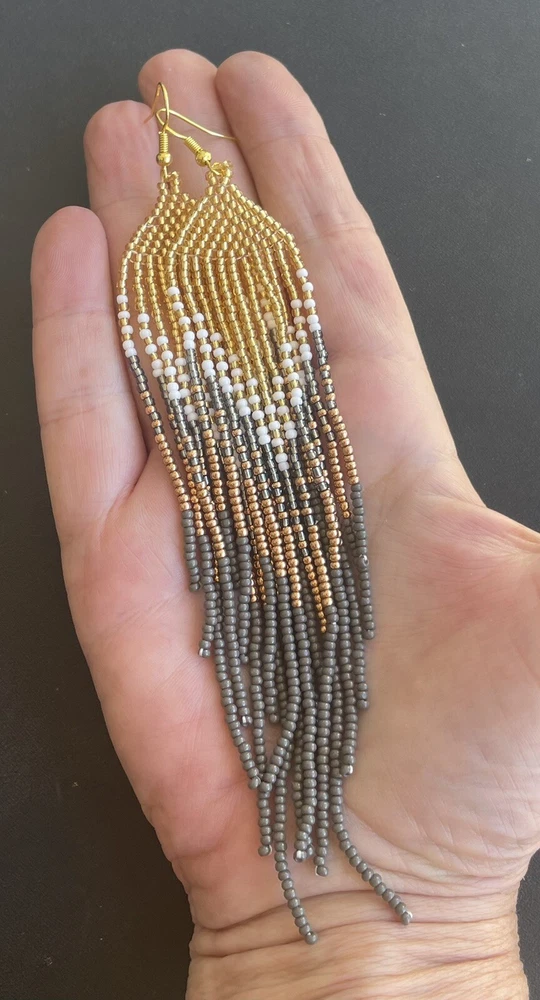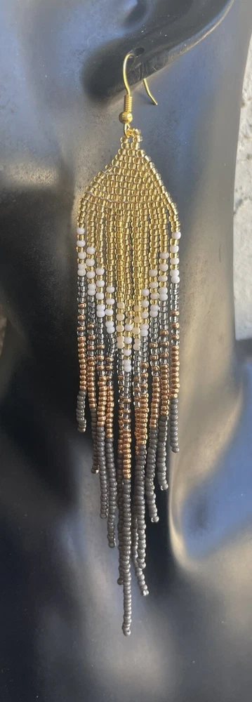 1 pair of gold, white, grey and bronze long seed bead beaded earrings. You will receive earrings pictured. The earrings are handmade with seed beads. The earrings are approximately 6 1/4" long with the ear hooks included. The ear hooks are sterling silver, gold plated. They are for pierced ears. 0-ea-seed-102-1
