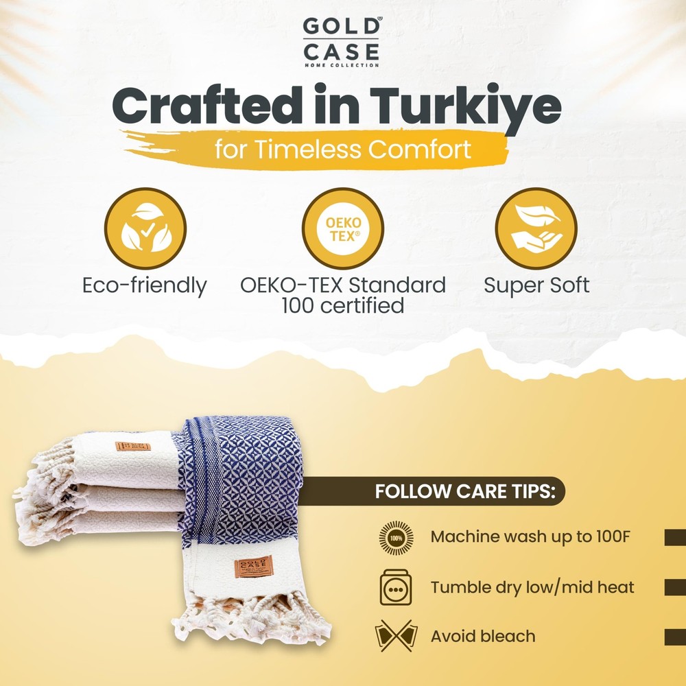 Embrace Pure Comfort: Our Turkish cotton hand towels offer a soft and plush embrace like no other. The Gold Case Turkish towel set is already washed to be super soft and absorbent. You can wash them in the machine, dry them in the machine on low/medium heat, or air-dry them. Don't use bleach. To keep them in good shape for a long time, it's best to air-dry them. Your Travel-Friendly Companions: Thin, lightweight, and generously sized, the 20 x 40 inches hand towel for bathroom redefines convenience for your on-the-go lifestyle. Perfect for travel, camping, or a quick yoga session, they take up minimal space while providing maximum comfort. Pack light, stay bright, and enjoy the freedom of movement with these versatile soft Turkish bathroom hand towels. Join The Eco-Conscious Wave With The Turkish Towel Set: Certified by OEKO-TEX Standard 100, our Turkish cotton hand towels for bathroom are your guilt-free indulgence. Embrace the joy of using a product that not only cares for your comfort but also cares for the environment. TRUE TURKISH CRAFTSMANSHIP & QUALITY: Indulge in the authentic luxury of the Aphrodite hand towels for bathroom set of 4, meticulously MADE IN TURKIYE. Made from 100% natural cotton, these bathroom hand towels boast genuine quality and durability, staying soft and highly absorbent for years. CARE INSTRUCTIONS: The holiday decorative hand towels for bathroom are pre-washed for enhanced softness. Machine wash up to 100°F and tumble dry on low/medium heat or line dry. Avoid bleach. Line drying extends the towel's lifespan. OEKO-TEX CERTIFIED ECO-FRIENDLINESS: Proudly certified by OEKO-TEX Standard 100, these hand towels for kitchen are free of harmful chemicals. Compact and convenient, four of these kitchen hand towels occupy the same space as a traditional terry towel. NO MORE DAMP DISCOMFORT: Our Turkish hand towels for bathroom redefine convenience with their quick-dry feature. In mere minutes, the Turkish hand towel dries completely, leaving no room for moisture or unpleasant odors. Use a bathroom hand towel that dries before you get out of the space. LONG-LASTING & DURABLE: Unlike others, we believe in the longevity and quality of our Turkish towels for bathroom, face, hand, yoga, and gym. Wash after wash, these Turkish kitchen towels improve in softness and absorbency.