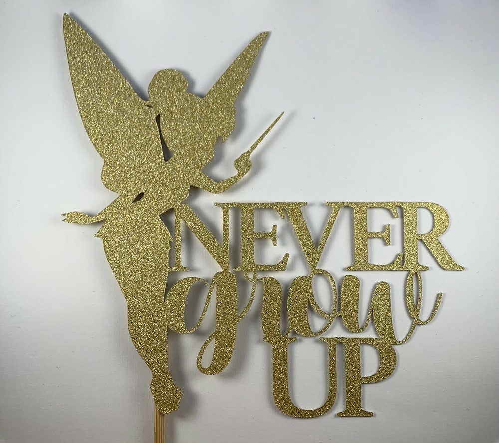 **Cake toppers are pre-made. No customization at this time** Our Letters by Jolee "NEVER GROW UP" cake topper is the perfect cake topper to add to your baby shower celebration. ♡ Our cake toppers are hand-made in Los Angeles, CA ♡ Made from high quality 250 gsm double sided gold glitter card stock on top of a bamboo stick ♡ No glitter shedding and no fall outs ♡ Topper cutout W x H: 6.10" x 6.23" (this measurement does not include the bamboo stick) ♡ Shipped with USPS First Class Mail