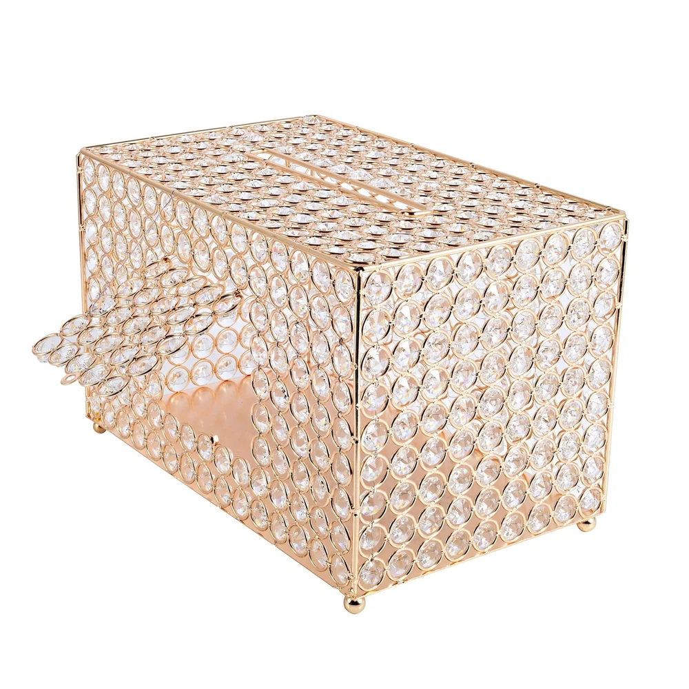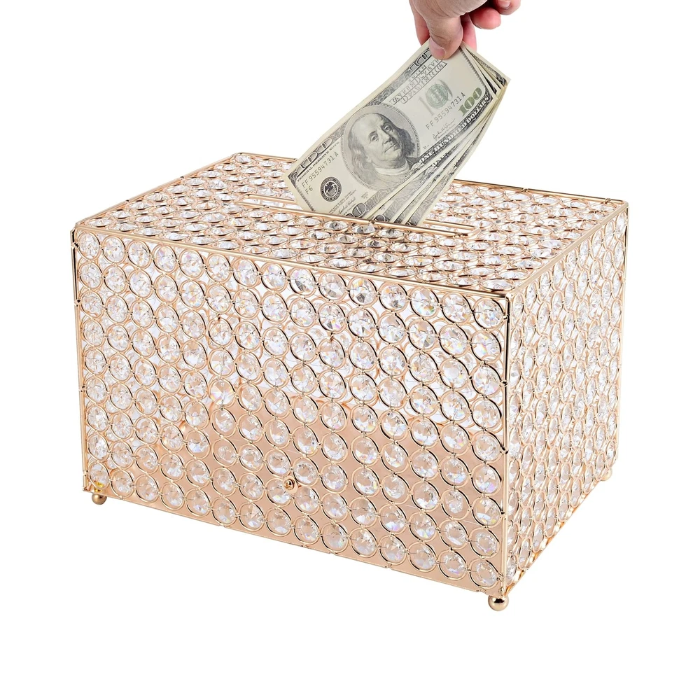 Gold Gift Card Money Box with Genuine Crystal Beads for Reception Wedding Anniversary Baby Shower Birthday Graduation Party Decoration,Wedding Card Cage (Gold) Product Details Color: Golden,Gold Brand: Kyriathe MPN: Does not apply UPC: Does not apply EAN: Does not apply Brand: Kyriathe Color: Golden,Gold Material: Plastic Style: Contemporary Product Dimensions: 12"L x 8"W x 8"H Brand: Kyriathe Color: Golden,Gold Material: Plastic Style: Contemporary Product Dimensions: 12"L x 8"W x 8"H Closure Type: Flip Top Shape: Square Number of Items: 1 Unit Count: 1.0 Count Item Package Quantity: 1 Occasion: Wedding, Graduation, Baby Shower, Anniversary, Birthday Item Weight: 4.89 pounds Manufacturer: Kyriathe Date First Available: September 8, 2021 Size:12"x8"x8" Simply ElegantThis wedding cardholder box is specifically designed to add magical flair and a hint of elite elegance. This unique crystal money box boasts a minimalistic and elegant look, and is specifically designed to hold business cards, collections, or donations. Exceptional AestheticsIndeed, a perfect accessory to level up the aesthetics, this designer money and card box is accented by a gorgeous layer of crystals enhancing its visual charm. This crystallized treasure money box is a piece of art and reflects the true craftsmanship of the designer. Excellent QualityThe decorative crystal box boasts a premium finish and is designed with optimum-quality glass crystals and the finest wire that makes the box stable, firm, apart from offering durability too. This home decor accessory is designed to survive normal wear and tear. Versatile UseIdeal for practical or decorative purposes, this crystal business card holder is ideal for contemporary or vintage-themed events. It has optimum space and allows you to store and hold the essentials easily, without any space limitations and keeping the content safe and secured.ory is designed to survive normal wear and tear. This golden box is LOADED with sparkling, GENUINE crystal beads that have outstanding clarity and a magnificent shine! Our crystal beads are real crystal, not acrylic and they are faceted on all sides. You will find sellers who "sneak" in plastic beads or mix acrylic with glass beads. We are fanatical that this is NOT done on our products. This box is really a piece of art! It stands 8 " tall on 4 balled feet and it's 13 3/8" long by 8 " wide (the box depth is 8"). The slot on the top is 8" long by " wide. If you have space limitations, you can set this on its side so the slot is vertical. As extraordinary as this box is, one of our favorite features is the security of the contents. This money box is as safe as a safe! On the backside is a 4 " square removable panel that's very hard to see " it blends in perfectly with the entire box and is secured by 2 small Phillips screws. This showy box is ready to go right out of the box but you could dress it up by placing it on glittery tulle and surround it with rose petals, crystal strands and flameless LED votives. Cards, donations, raffles, money, collections or drawings. Of all the details you have to work out for your wedding, reception or special event, this is one of the most essential ones so do it with style and elegance while keeping your contents safe! Please view the short video below to see why we're so proud of our Prestige products!
