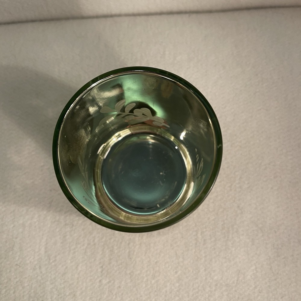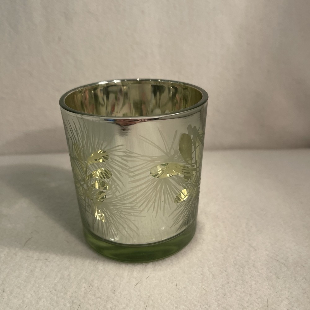 This elegant gold glass candle votive holder features a beautiful floral pattern with evergreen and berry accents. The round shape and contemporary style make it suitable for all occasions and decor. It can hold mini candles and add a decorative touch to any room. The holder is original and was manufactured between 2010-2019. The finish is gold and the material is glass. It measures 3.25" in height and 2.75" in width, and weighs 7.2 oz. Perfect for collectors or as a gift. Excellent condition. No chips or cracks.