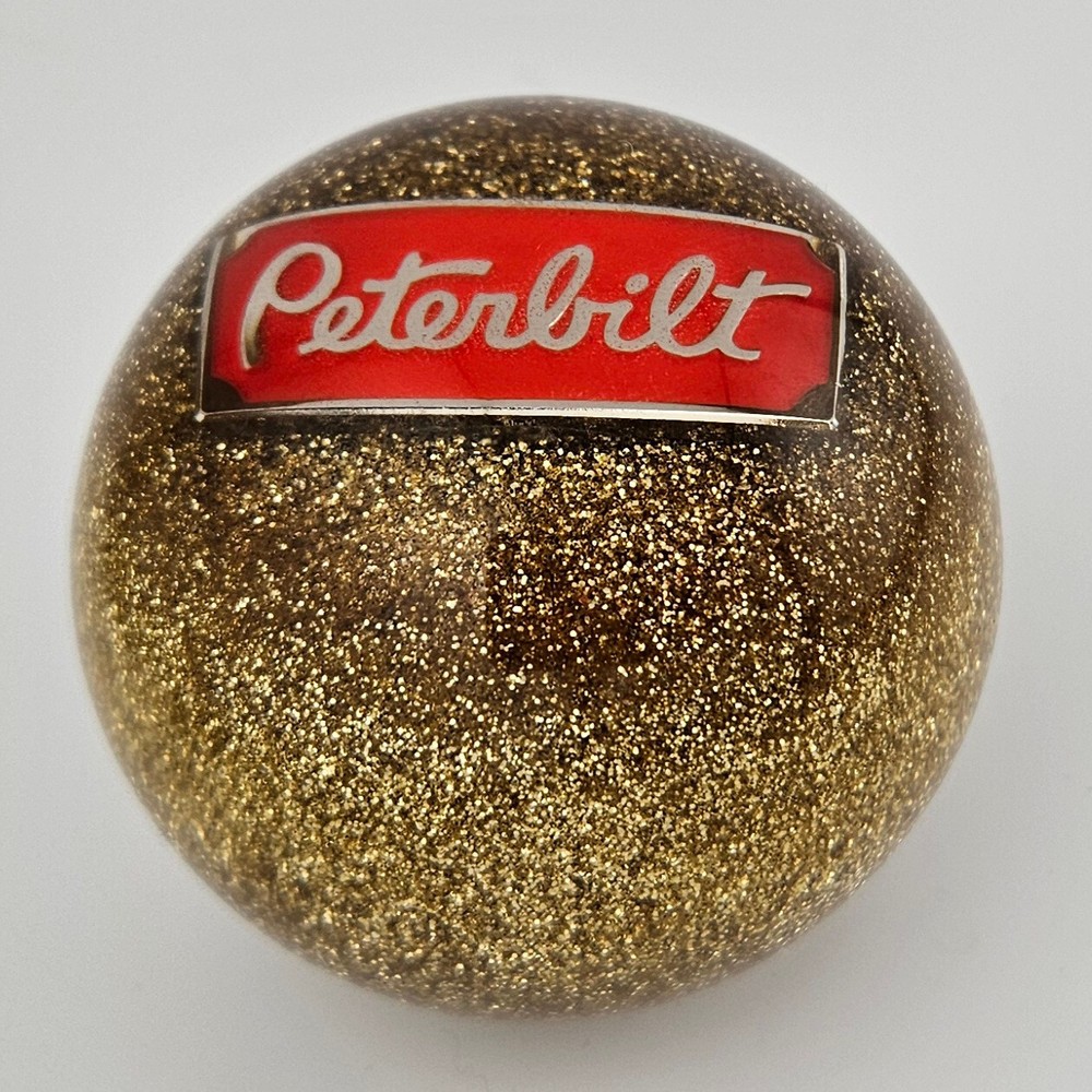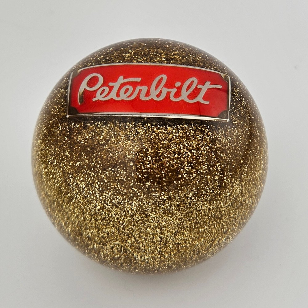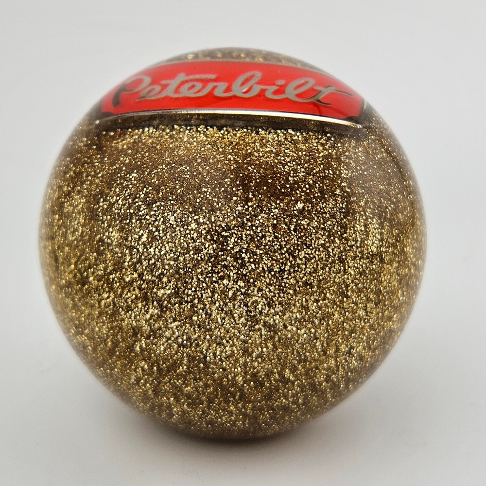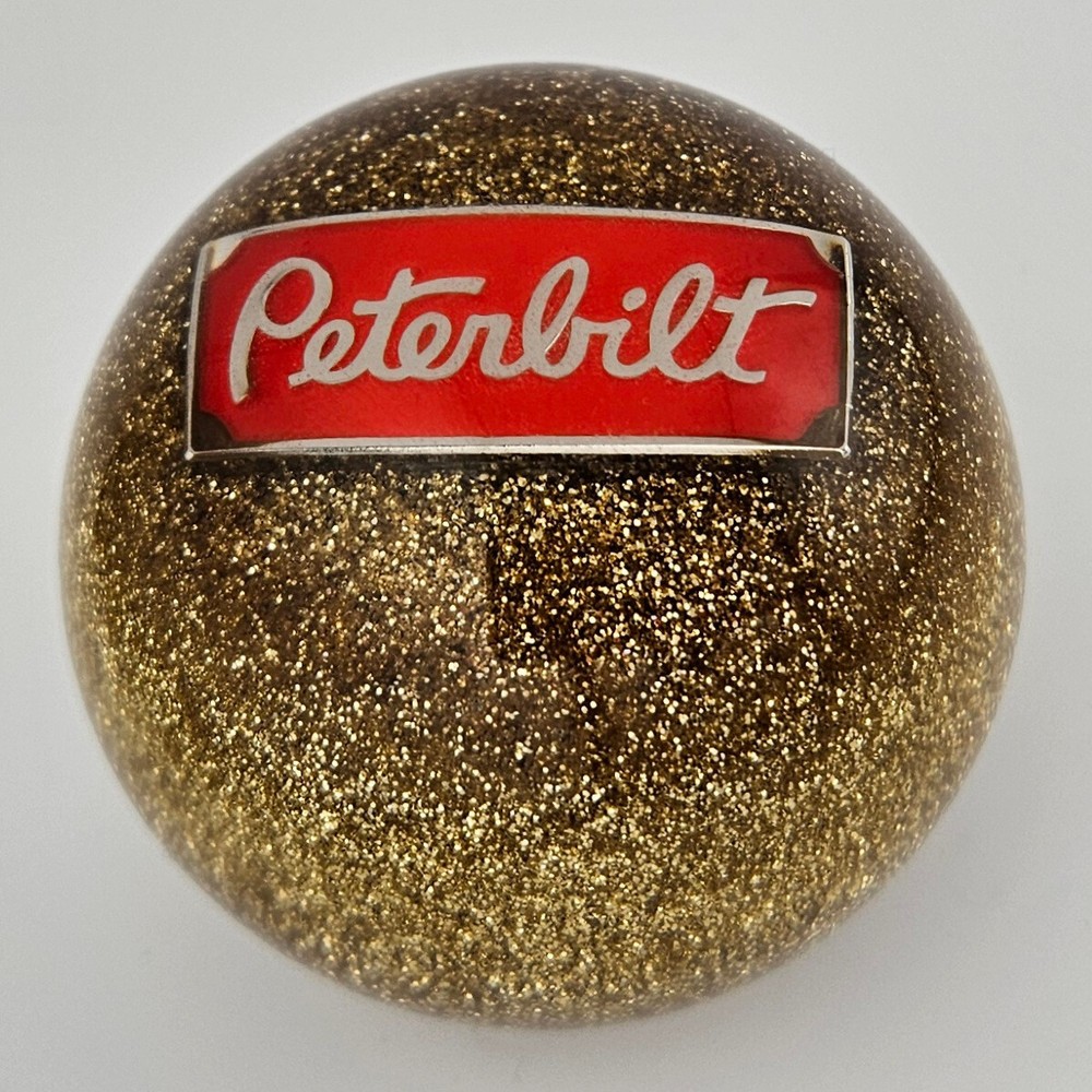 Gold glitter ball shift knob with red Peterbilt square * Hand made in the USA with high quality materials, heavy duty solid core construction and quality you can see and feel * Completely embedded deep thread metal insert to withstand the constant pull of a brake knob and years of heavy shifting * Embedded emblem under the surface with a mirror polish finish over the top that protects the emblem and knob from fading * 1/2 x 13 deep thread metal insert * Stainless steel jam nut included Dimensions: 2.25" * Used, like new condition
