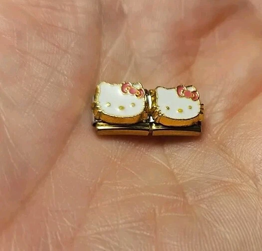 Hello Kitty Italian Charm gold trim. These silver color gold trim links are designed with 3d metal and enamel charms. The links are adjustable and can be connected to form a unique and fun bracelet. Perfect for any occasion, these charm links are suitable for gifts, Christmas, graduation, anniversary, birthday, engagement, Mother's Day, holiday, Father's Day, christening, confirmation/communion, Valentine's Day, or just because. The multicolor charms are made of stainless steel and enamel, and they are compatible with any 9MM setting style. Get your hands on these Italian charm links and add a touch of fun to your jewelry collection today!
