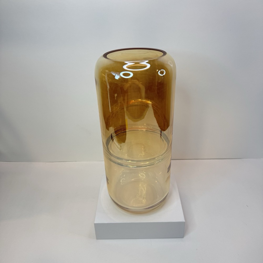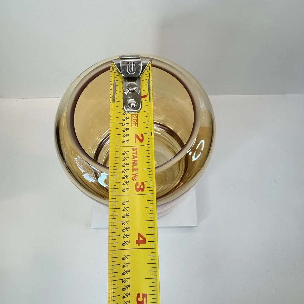 Add a touch of elegance to any room with this stunning gold iridescent pill-shaped glass vase. The oval shape and solid pattern make it a unique addition to your home decor, while the 9.5" length and 4" width provide ample space for your favorite flowers or decor. Crafted from high-quality glass, this vase is easy to clean with a damp cloth or spirit. Hand wash only to keep it looking its best. Its pop art style and flower vase type make it a perfect statement piece for any room. This vase is suitable for adults and does not require any additional parts to use. Good used condition. There is a small “flea bite” chip in the opening. Please see photos for details.