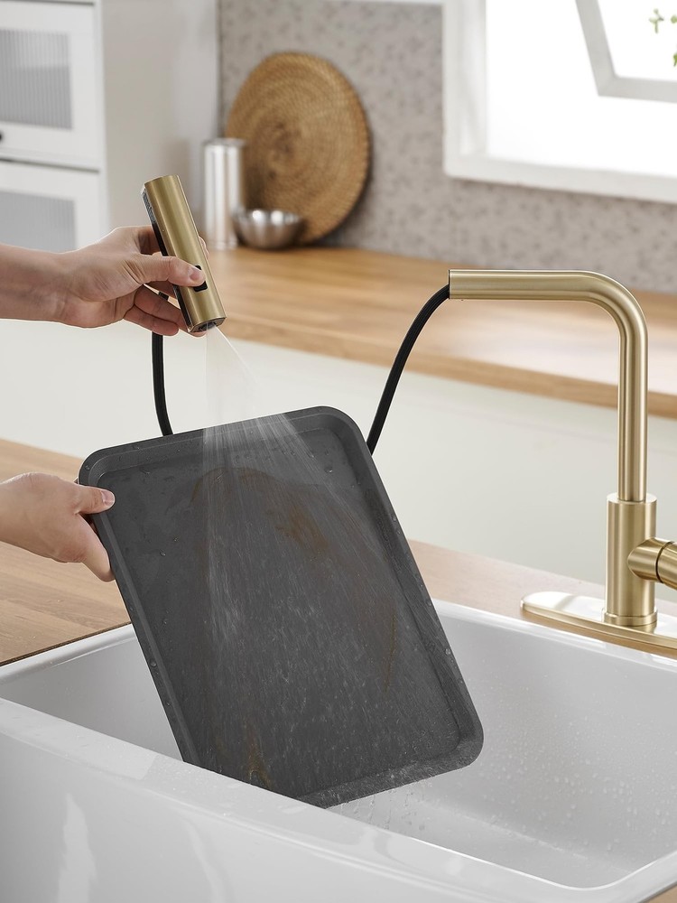 Gold Kitchen Faucets with Pull Down Sprayer,Waterfall Kitchen Sink Faucet,Commercial Utility Stainless Steel Kitchen Faucets,Single Handle Kitchen Sink Faucet with Pull Down Sprayer for 3 Function Product Details Color: Matte Gold Style: Waterfall Brand: JOOM MPN: JU011G01 UPC: Does not apply EAN: Does not apply Brand: JOOM Recommended Uses For Product: Kitchen Mounting Type: Deck Mount Finish Type: Lacquered Material: Stainless Steel Color: Matte Gold Number of Handles: 1 Included Components: Sprayer Hole Count: 1 Special Feature: Pull Down Sprayer Brand: JOOM Recommended Uses For Product: Kitchen Mounting Type: Deck Mount Finish Type: Lacquered Material: Stainless Steel Color: Matte Gold Number of Handles: 1 Included Components: Sprayer Hole Count: 1 Special Feature: Pull Down Sprayer Handle Type: Lever Style: Waterfall Installation Type: Single Hole Model Name: JU011-12 Handle Material: Stainless Steel Warranty Type: limited Handle Location: Center Spout Design: Waterfall Is Electric: No Manufacturer: JOOM Product Dimensions: 3.2"D x 9.5"W x 18"H Part Number: JU011G01 Item Weight: 3.63 pounds Country of Origin: China Item model number: JU011-12 Finish: Lacquered Special Features: Pull Down Sprayer Batteries Included?: No Batteries Required?: No Date First Available: March 11, 2024 Powerful faucet sprayer:The JOOM Kitchen Faucet a robust wide spray to eliminate stubborn residues, a gentle aeratorstream for delicate fruit rinsing, and a sweeping spray for extensive coverage. Unmatched Flexibility:The Kitchen Faucet provides unparalleled flexibility with a 360 swivel spout and a retractable PEX hose. Single-Handed Control:The single-handle mechanism empowers you to control water temperature and flow volume with one hand. Free up the other hand for multitasking, transforming kitchen chores into fluid, time-efficient activities. Premium Craftsmanship:The waterfall kitchen faucet. Crafted from eco-friendly SUS 304 stainless steel, it resists corrosion and rust. No Plumbers Needed:Designed for your convenience, the faucet for the kitchen sink comes with a pre-attached deck plate and pre-installed hoses.