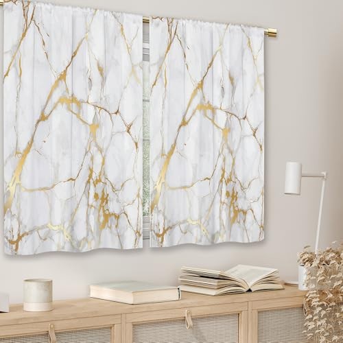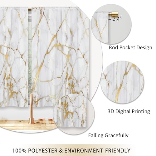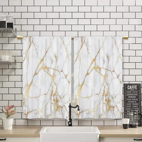 Return Policy Fast Delivery Trusted seller Gold Marble Kitchen Curtains Golden Luxury Abstract Small Short Cafe Window Curtains White Modern Texture Ink Rod Pocket Bathroom Window Drapes Treatment Tier Curtains 2 Panels (26x36 Inch) Product Description 【Modern Design】 This gold marble cafe curtains modern design in white & gold color matched, add elegance to window treatments and overall appearance of the room. 【Ready Made】 Package includes 2 panels curtains, each panel measuring 26" width x 36" length. Each panel has 2.4 inch high pole pocket, which works well with tension rods or normal rods, easy to install and slide. It is recommended to use a rod with a diameter of 1.2 inch or less. 【Light Filtering】 The small curtains have just the right thickness to let in some light and also provide privacy. They will block a sun reflection, but not all of the light. You can cover the lower portion of your windows to provide privacy or used alone on shorter length windows, a great highlights to the kitchen. 【Easy Care】 Please machine wash separately with cold water, using mild detergent. Tumble dry low and no bleach. Simple iron is suggested before use. 【Nice Service】 Decorate your home, high quality. Nice after-sale service. Your 100% satisfaction is our first priority. Just contact customer support if you would like to return our products for any reason. Shipping Returns Payment Shipping Shipping is FREE to all addresses other than APO/PO boxes in the lower 48 states. All our stock ships from US-based warehouses. Shipped via USPS or UPS (depending on location and package weight) Unless stated otherwise, all orders will ship within 24-72 hours of your payment being processed. Check our feedback to see the great reviews of FAST shipping we offer. Returns Seller does not accept returns Payment We currently accept payment via eBay managed payments only. Once payment is cleared, we will dispatch your shipment within 1-3 business days. Please refer to the "Shipping" tab for more information regarding shipping speed to your destination.