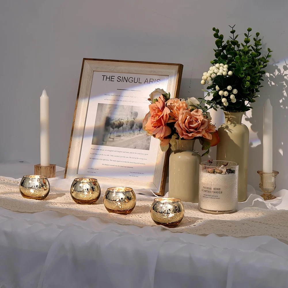 The warm gold finish exudes sophistication and will complement a variety of wedding themes, making it a versatile addition to your décor. Whether you're using it as a centerpiece, accent piece, or favor for your guests, our Gold Votive Candle Holder is sure to impress. But that's not all! Our mercury glass candle holder is also incredibly versatile and can be used long after your special day. Imagine the ambiance it would create when placed on your mantle or coffee table at home. Don't miss out on the opportunity to add a touch of luxury to your wedding day. Order your Gold Votive Candle Holder today and elevate your event to the next level! 😻 Perfect Size: These elegant bowl-shaped gold votive candle holders are perfectly sized for regular tea light candles.With a height and diameter of 2 inches each, they are perfect for any celebration. 😻 Beautiful Table Centerpieces: Made of high-quality mercury glass material, these candle holders sparkle and shine and are perfect for creating magnificent wedding centerpieces for table settings or adding a touch of excitement to any celebration. 😻 Versatile Use: These stunning tealight candle holders can be used in various settings, from indoors to outdoors, and bring an air of sophistication to any table setting or room. 😻 Durable and Safe Packaging: Each mercury glass candle holder is carefully and securely packaged with bubble wrap to prevent any damage during transportation and ensure that you receive your gold candle holder set in perfect condition. 😻 Stylish and Timeless Design: These beautiful gold votive candleholders are both modern and classic, making them a perfect addition to any table setting, table centerpiece, or room decor. They are a great way to add charm, warmth, and sophistication to any space.