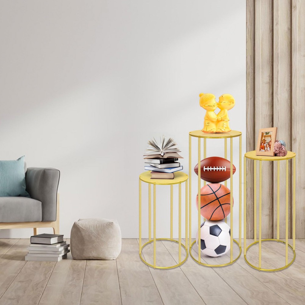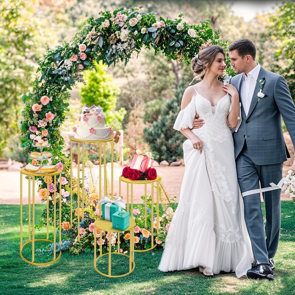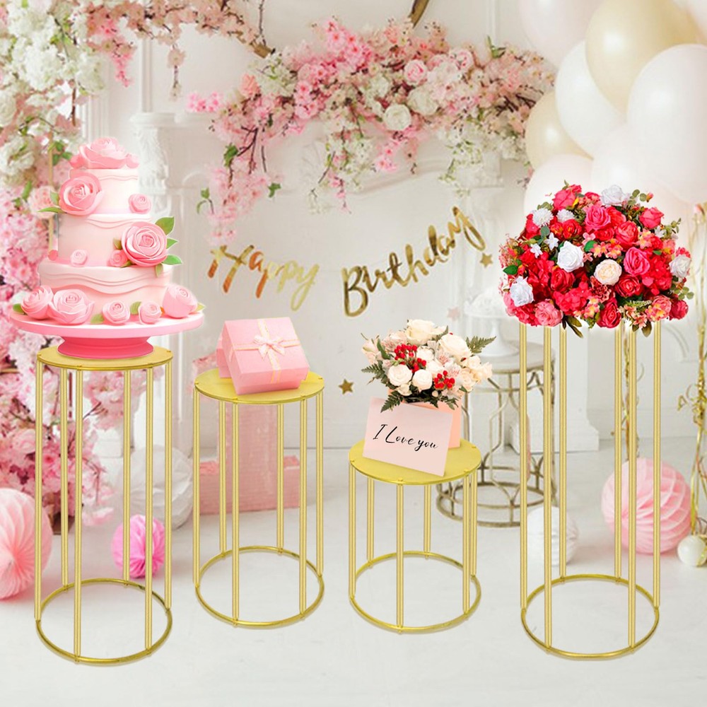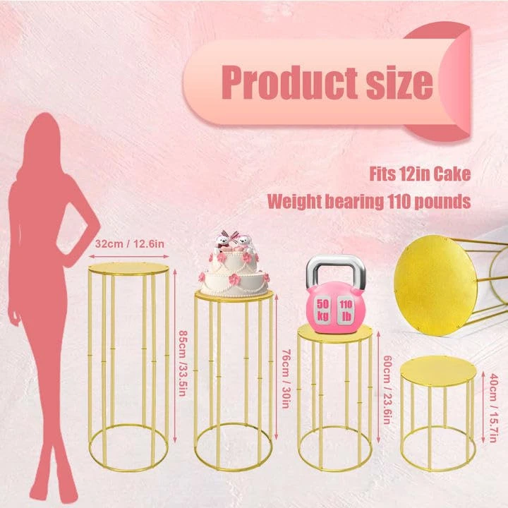 Atmosphere Builder: Our round metal display stand set 4Pcs(S:26.6" H:33.5", 30", 23.6", 15.7") Gold metal wedding stand is one of the most popular party decorations nowadays. Take a look at the arches on Ins and Tiktok, you can decorate them with balloons, flowers, or other elements to create a personalized backdrop for the stand. It can be used indoors or outdoors High Quality: The gold plant pedestal stand is made of high-quality metal and baking process, durable, corrosion-resistant. Each bracket has 6 iron pipes, which are more stable than 4 iron pipes and can withstand a weight of 110Ib. It can be reused several times, environmental protection and sanitation, and does not take up space Easy Installation: The cylinder pedestal stands base arrangement stand with an Upgraded screw connection, can be quickly assembled in minutes.The product comes with installation tools that can be disassembled and placed in a cardboard box after use. The cardboard box has a small volume and is convenient for transportation and storage Suitable for Various Occasions: The cylinder pedestal stands for parties, birthday parties, wedding decorations, Christmas decorations, New Year's decorations, bachelor parties, school opening ceremonies, graduation party decorations, candy buffets, dessert tables, commercial celebration decorations, and party photo background. You can reuse it on various occasions Customer Service: This will be a shopping without worry. If the metal display stands set you receive has any quality problems, is not satisfied, or is damaged in use, please contact us, We will give you 100% satisfied handling