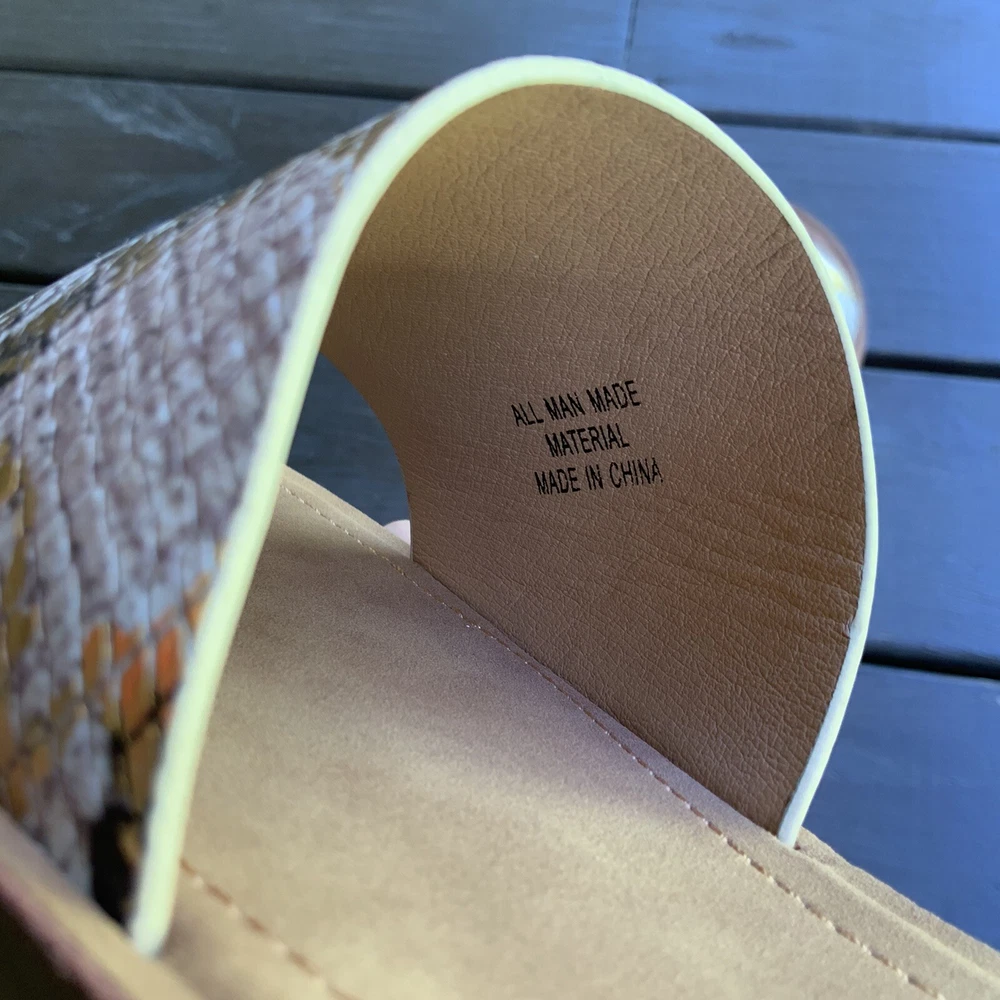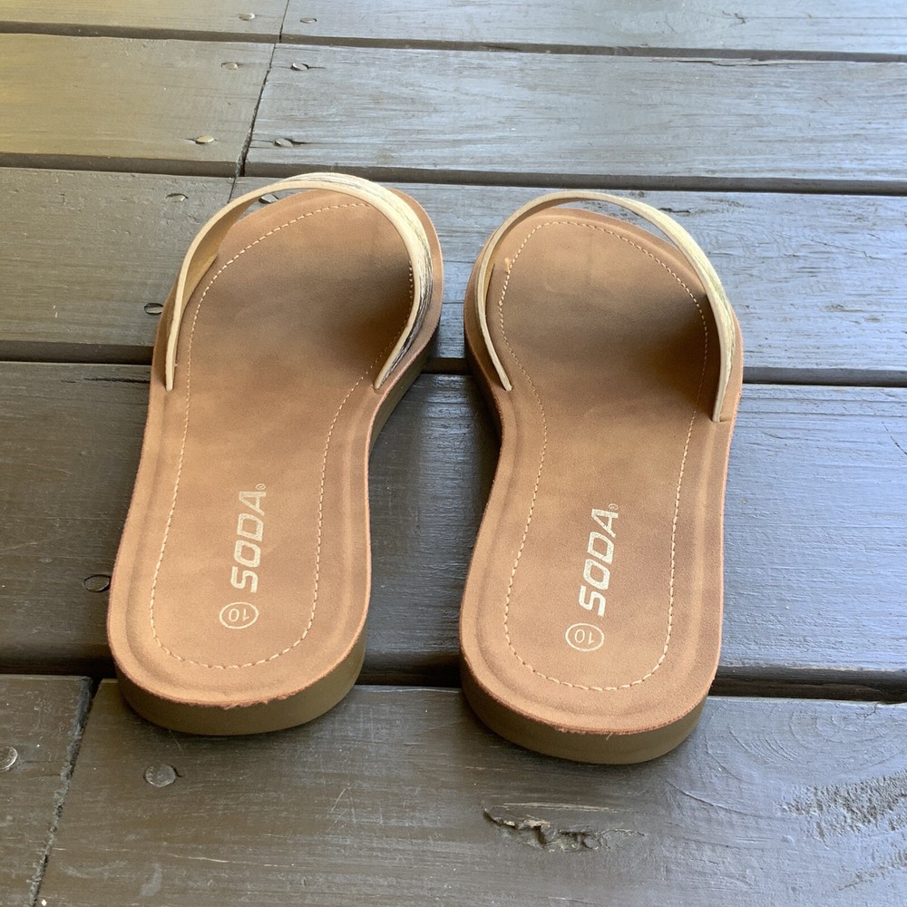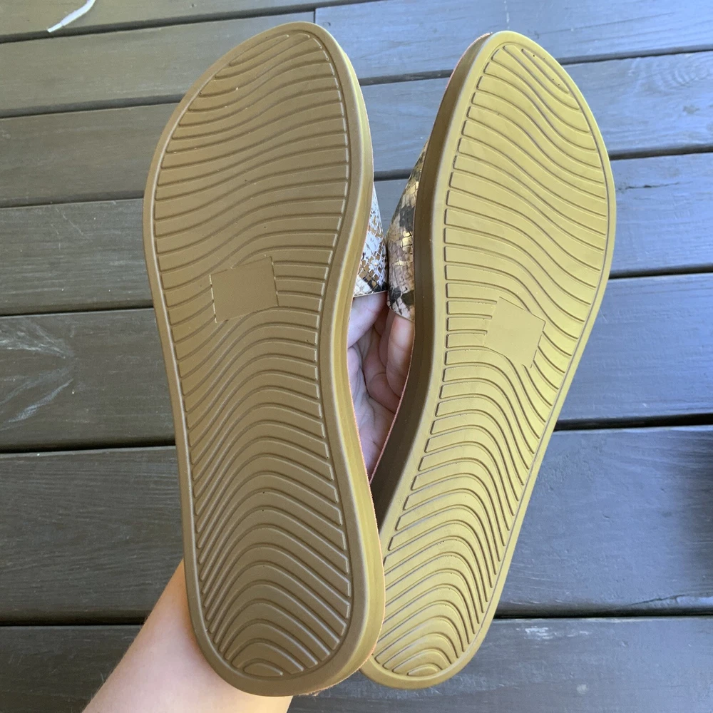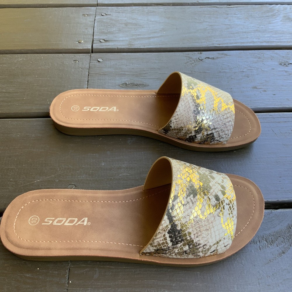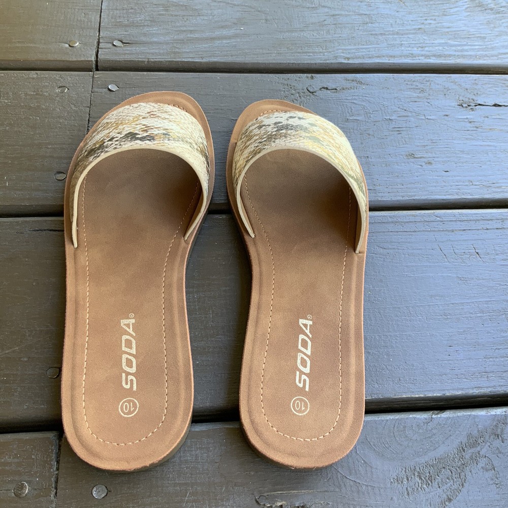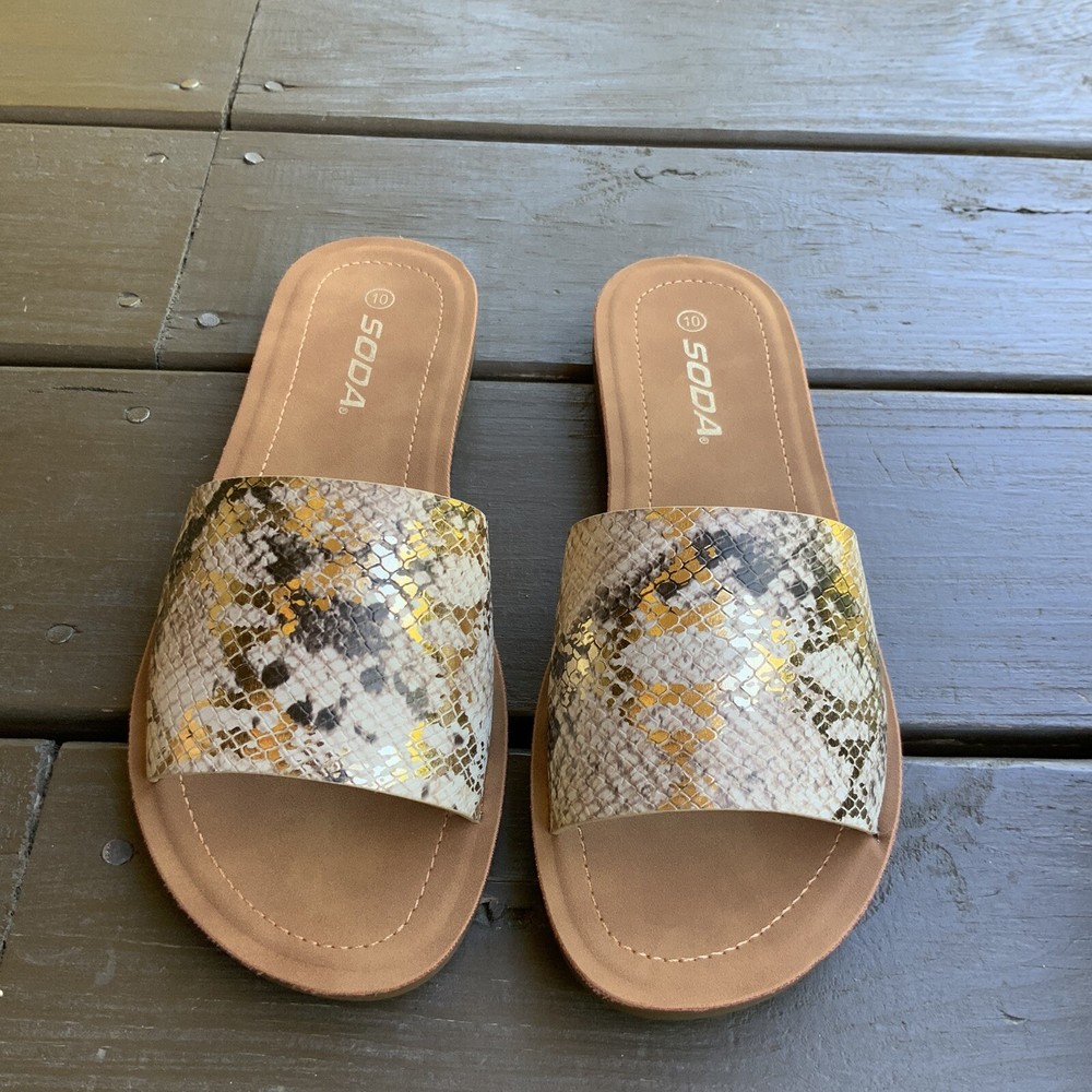 Excellent like new condition Soda Slide sandals Gold metallic snake print, tan inside Flat Size 10