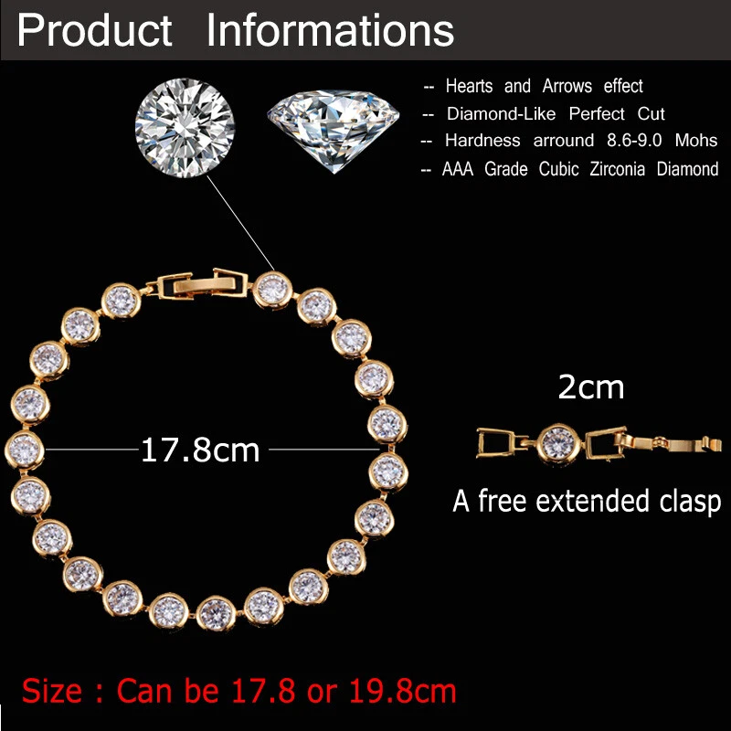 Gold Plated CZ Multicolored Women Round Tennis Bracelet Wristband Chain Jewelry Specifications: 1. Condition: New 2. Material : Cubic Zirconia 3. Bracelet Length :18 cm + 2.4 cm extended clasp Features: 1. Cubic Zirconia High Quality Material - Diamond-like Brilliance , Prong Setting and CZ Stone are stable. 2. It will be an Ideal Gift for Your Girlfriend, Wife, Fiancee, Daughter, Mother, Your Special Someone, or just Yourself. 3. Wearing Occasion: Daily wear, Shopping , Anniversary , Party , Wedding , Christmas , New Year , Valentine's Day ,etc. Package Includes: 1Pc Bracelet Payment Delivery details Terms of sales About us Contact us Payment 1. We only accept payment by Paypal 2. We request you pay within 5 days of the first auction close. Failure to do so may cause our automated dispute system to file disputes for unpaid items Delivery details We only send items to the registered eBay address.Items will be shipped within 2 business days from the date payment is received (not include public holiday and weekend) . As per eBay regulations, import duties, taxes, and customs charges are the buyer's responsibility. Please check with your country's customs office to determine what these additional costs may be prior to bidding or buying. Terms of sales After-Sale Please contact us to request a return/replace/refund authorization.It will be best if you use ebay message to contact me. 1, Return and replacement request is available only the requests within 30 days after parcel received. 2, Returning the item as the same condition as received. Situation and solution Defectives ---Please contact us and provide a photo of the defective part. After situation confirmed,we will offer you refund/return/replacement according to the situation Not as Described ---Please contact us and provide a photo of the wrong part. After situation confirmed,we will offer you refund/return/replacement according to the situation Not Received ---Please undersatnding shipping on the way was out of our control ,because of the busy shipping season,holidays,bad weather or force majeure etc. It may be delay for days. But if it took too much time and not deliveried, Please message me, I will offer you solution for it. About us Working time: Chinese time(Eastern eight zones):Monday to Friday ,9:00 am to 6:00 pm. We do not work on chinese legal holiday. Message reply: We will reply all messages within 24 hours of business time. Contact us Please contact us via ebay message, it was the best way for both you and us to solve problems. Any questions or anything you need, please feel free to contact us.