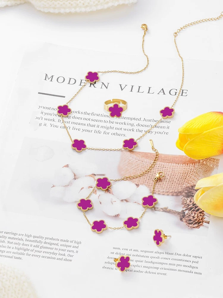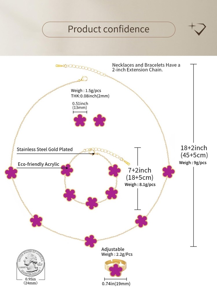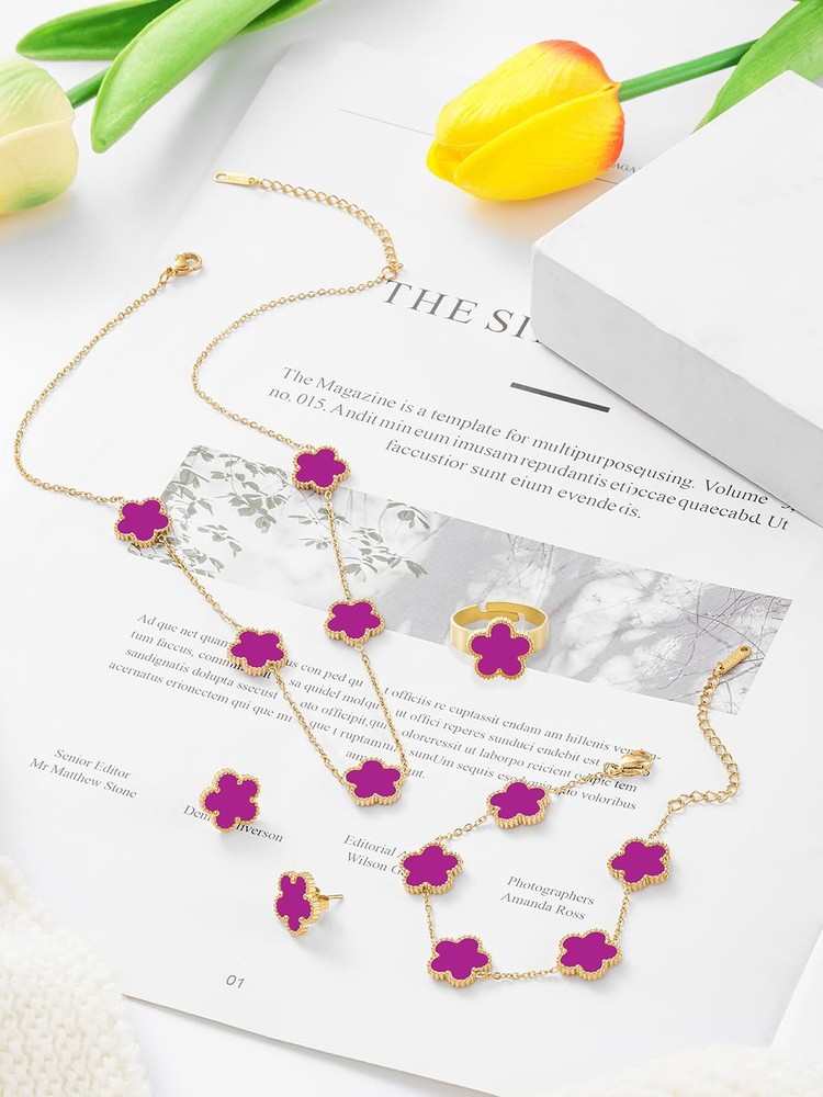 Gold Plated Five Leaf Clover Necklace Bracelet Rings and Stud Earrings Set for Women Lucky Flower Jewelry Product Details Color: Purple-14K Gold Plated Brand: Qinpan MPN: DZTZ1026 UPC: 737745261464 EAN: 0737745261464 Item Weight : 0.8 ounces Department : womens Date First Available : October 21, 2024 Manufacturer : QINPAN Brand, Seller, or Collection Name: Qinpan Material: Stainless Steel Gem Type: No Gemstone Item Length: 18 inches Chain: Link Chain Clasp: Lobster Clasp Ring size: 7.5 Number of stones: 13 Stone Weight: 13 cttw Metal: Yellow Gold Plated Stainless Steel Metal stamp: No Metal Stamp Metal Weight: 20 g Stone shape: Irregular Minimum clarity: Slightly Included Cut: Very Good Add endless sparkle to any special occasion with QINPAN's gorgeous necklace bracelet rings and stud set with plastic. Don't miss these set stunners, meticulously accented with inlaid chalcedony gems. These gleaming dangling necklace bracelet rings and earrings are surefire head-turners, whether worn for proms, bridesmaids, cocktail parties, mothers of the bride, holiday galas or with jeans and a sweater! We love the "dress up" or "dress down" versatility of these fashion dangle necklace earrings rings and bracelet set. Treat yourself or someone you love to some jewelry at a fabulous price. Caring For Your Jewelry: Our Jewelry are made of Genuine high-grade Material, as long as the proper maintenance, ensure wearing years still bright as new. They don't need to use very expensive maintenance water, just to avoid acid-base and moist environment.Perfume is also corrosive to jewelry. Humid conditions include: don't wear when shower, washing face, sweating, deposit before application of dry cloth to wipe dry.