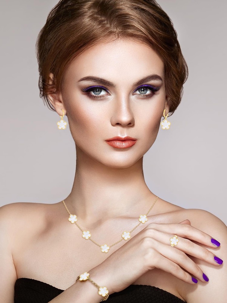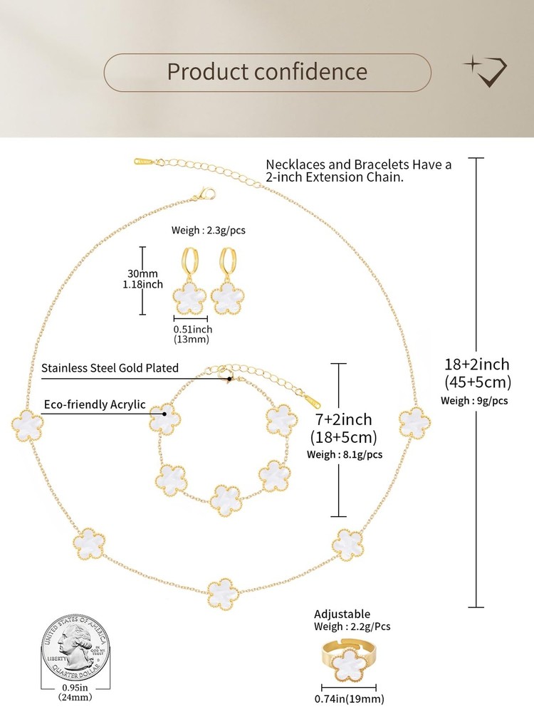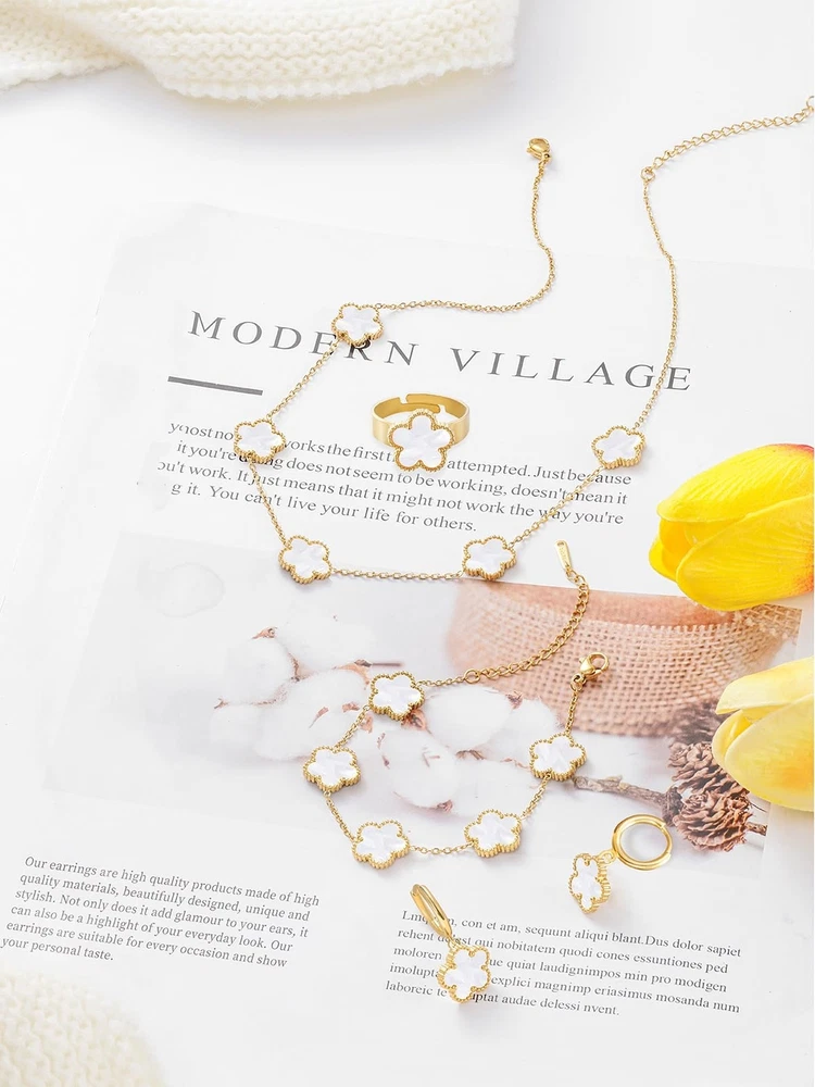 Gold Plated Five Leaf Clover Necklace Bracelet Rings and Dangle Earrings Set for Women Lucky Flower Jewelry Product Details Color: White-14K Gold Plated Brand: Qinpan MPN: DZTZ1032 UPC: 737745262072 EAN: 0737745262072 Item Weight : 0.85 ounces Department : womens Date First Available : October 22, 2024 Manufacturer : QINPAN Brand, Seller, or Collection Name: Qinpan Material: Stainless Steel Gem Type: No Gemstone Item Length: 18 inches Chain: Link Chain Clasp: Lobster Clasp Ring size: 7.5 Number of stones: 13 Stone Weight: 13 cttw Metal: Yellow Gold Plated Stainless Steel Metal stamp: No Metal Stamp Metal Weight: 21 g Stone shape: Irregular Minimum clarity: Slightly Included Cut: Very Good Add endless sparkle to any special occasion with QINPAN's gorgeous necklace bracelet rings and earrings set with plastic. Don't miss these set stunners, meticulously accented with inlaid chalcedony gems. These gleaming dangling necklace bracelet rings and dangle earrings are surefire head-turners, whether worn for proms, bridesmaids, cocktail parties, mothers of the bride, holiday galas or with jeans and a sweater! We love the "dress up" or "dress down" versatility of these fashion dangly earrings necklace rings and bracelet set. Treat yourself or someone you love to some jewelry at a fabulous price. Caring For Your Jewelry: Our Jewelry are made of Genuine high-grade Material, as long as the proper maintenance, ensure wearing years still bright as new. They don't need to use very expensive maintenance water, just to avoid acid-base and moist environment.Perfume is also corrosive to jewelry. Humid conditions include: don't wear when shower, washing face, sweating, deposit before application of dry cloth to wipe dry.