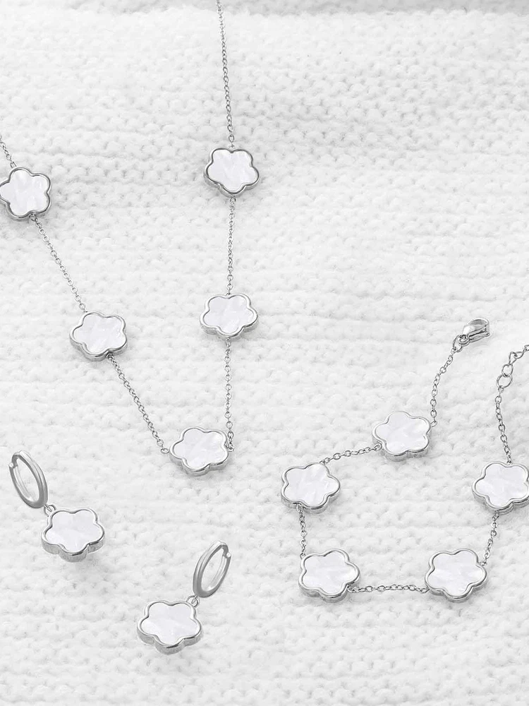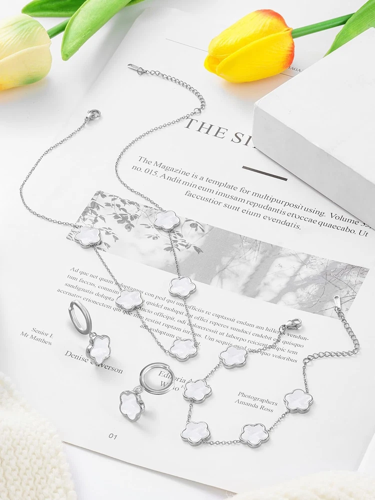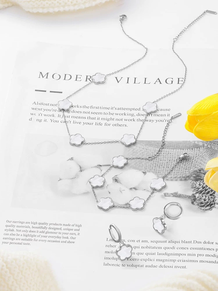 Gold Plated Five Leaf Clover Necklace Bracelet and Dangle Earrings Set for Women Lucky Flower Jewelry Product Details Color: White-White Gold Plated Brand: Qinpan MPN: DZTZ1013 UPC: 782279245701 EAN: 0782279245701 Item Weight : 0.75 ounces Department : womens Date First Available : October 8, 2024 Manufacturer : QINPAN Brand, Seller, or Collection Name: Qinpan Material: Stainless Steel Gem Type: No Gemstone Setting: Bezel Setting Item Length: 18 inches Chain: Link Chain Clasp: Lobster Clasp Ring size: 8 Number of stones: 12 Stone Weight: 15.00 cttw Model number: DZTZ1001 Metal: Yellow Gold Plated Stainless Steel Metal stamp: No Metal Stamp Metal Weight: 19 g Minimum color: White Minimum clarity: SI1-SI2 Stone shape: Flower Cut: Very Good Stone Creation Method: Synthetic Stone Treatment Method: Clarity Enhanced Add endless sparkle to any special occasion with QINPAN's gorgeous necklace bracelet and dangle earring set with plastic. Don't miss these set stunners, meticulously accented with inlaid chalcedony gems. These gleaming dangling necklace bracelet and earrings are surefire head-turners, whether worn for proms, bridesmaids, cocktail parties, mothers of the bride, holiday galas or with jeans and a sweater! We love the "dress up" or "dress down" versatility of these fashion dangle necklace earrings and bracelet set. Treat yourself or someone you love to some jewelry at a fabulous price. Caring For Your Jewelry: Our Jewelry are made of Genuine high-grade Material, as long as the proper maintenance, ensure wearing years still bright as new. They don't need to use very expensive maintenance water, just to avoid acid-base and moist environment.Perfume is also corrosive to jewelry. Humid conditions include: don't wear when shower, washing face, sweating, deposit before application of dry cloth to wipe dry.