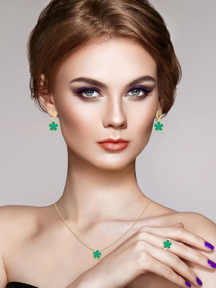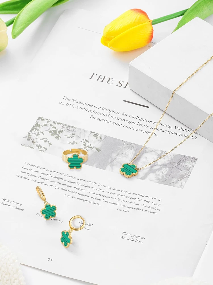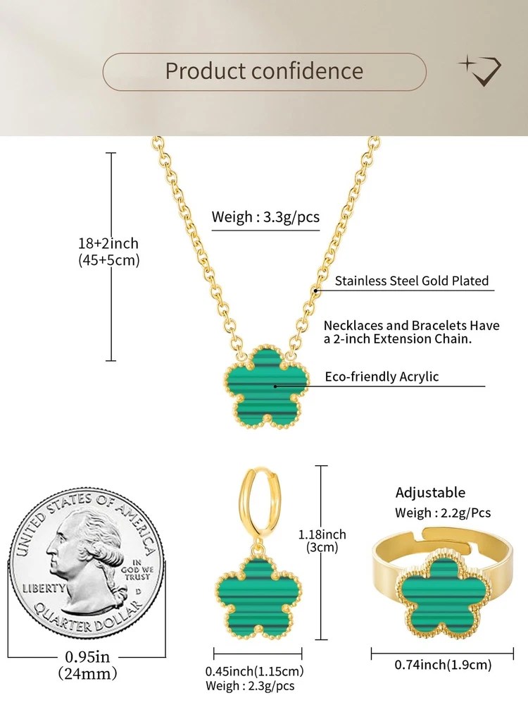 Gold Plated Five Leaf Clover Necklace Rings and Dangle Earrings Set for Women Lucky Flower Jewelry Product Details Color: Green Stripe-14K Gold Plated Brand: Qinpan MPN: DZTZ1036 UPC: 737745262591 EAN: 0737745262591 Item Weight : 0.35 ounces Department : womens Date First Available : October 22, 2024 Manufacturer : QINPAN Brand, Seller, or Collection Name: Qinpan Material: Stainless Steel Gem Type: No Gemstone Item Length: 18 inches Chain: Link Chain Clasp: Lobster Clasp Ring size: 7.5 Number of stones: 4 Stone Weight: 4 cttw Metal: Yellow Gold Plated Stainless Steel Metal stamp: No Metal Stamp Metal Weight: 9 g Stone shape: Irregular Minimum clarity: Slightly Included Cut: Very Good Add endless sparkle to any special occasion with QINPAN's gorgeous necklace rings and earrings set with plastic. Don't miss these set stunners, meticulously accented with inlaid chalcedony gems. These gleaming dangling necklace rings and dangle earrings are surefire head-turners, whether worn for proms, bridesmaids, cocktail parties, mothers of the bride, holiday galas or with jeans and a sweater! We love the "dress up" or "dress down" versatility of these fashion dangly earrings necklace and rings set. Treat yourself or someone you love to some jewelry at a fabulous price. Caring For Your Jewelry: Our Jewelry are made of Genuine high-grade Material, as long as the proper maintenance, ensure wearing years still bright as new. They don't need to use very expensive maintenance water, just to avoid acid-base and moist environment.Perfume is also corrosive to jewelry. Humid conditions include: don't wear when shower, washing face, sweating, deposit before application of dry cloth to wipe dry.