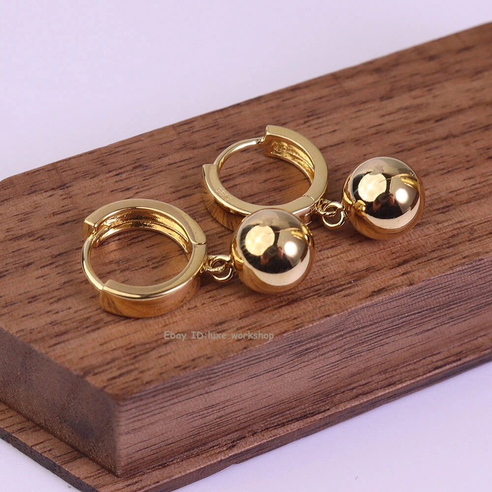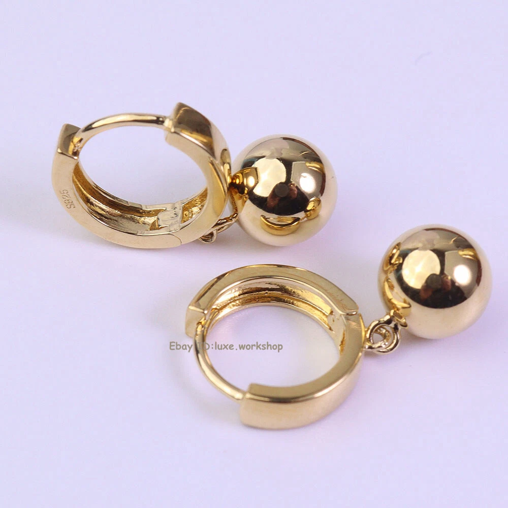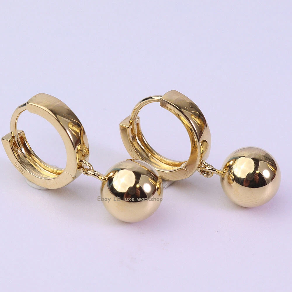 Gold Plated Real 925 Sterling Silver Polish Ball Fine Earrings Drop Hoop 0.9inch