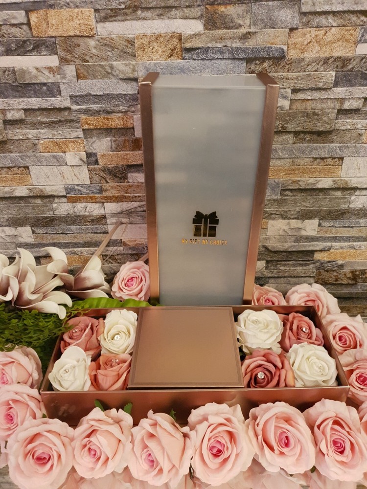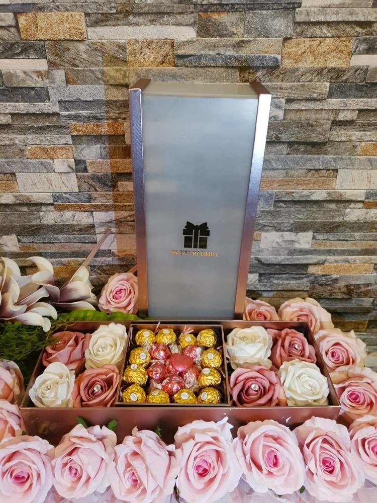 This Gift Box is a Luxury gift to your loved ones elegant and glamorous box with artificial roses. You can customise your box and make it extra special. Free customisation. You can request different flowers colour , different types of chocolates or add more items we will do our best to make it possible You can add messages and note to your basket. No Need for wrapping You can add a message to your gift at the checkout No Substitution what you see is what you will receive This Gift Box Includes: 1 Gift Box Lindor and Ferrero Rocher chocolate Heart shape Milk Chocolate You can add extra items to your box from our collections e.g. Jewellery or keyrings, mugs and more. Extra Large Velvet Rose with Crystal