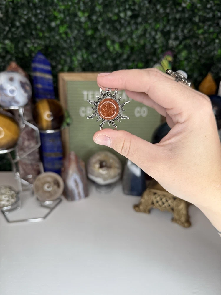 Listing is for one (1) Gold Sandstone Crystal Sun necklace. Pendant comes on 18in chain, 925 silver plated (copper), 1.2mm. Chain is durable, bright, and dainty. Lobster claw clasp. Jewelry Care Instruction card will be included in each order. Avoid sprays or lotions near jewelry to avoid tarnishing. Keep jewelry from getting wet; remove before bathing, swimming, hand washing. Remove before vigorous exercise. #crystal #sun #necklace #jewelry #sandstone