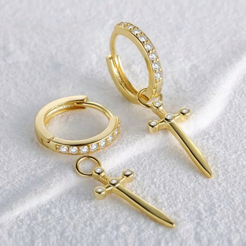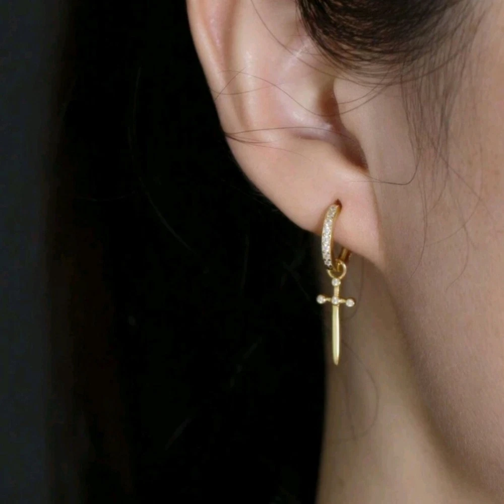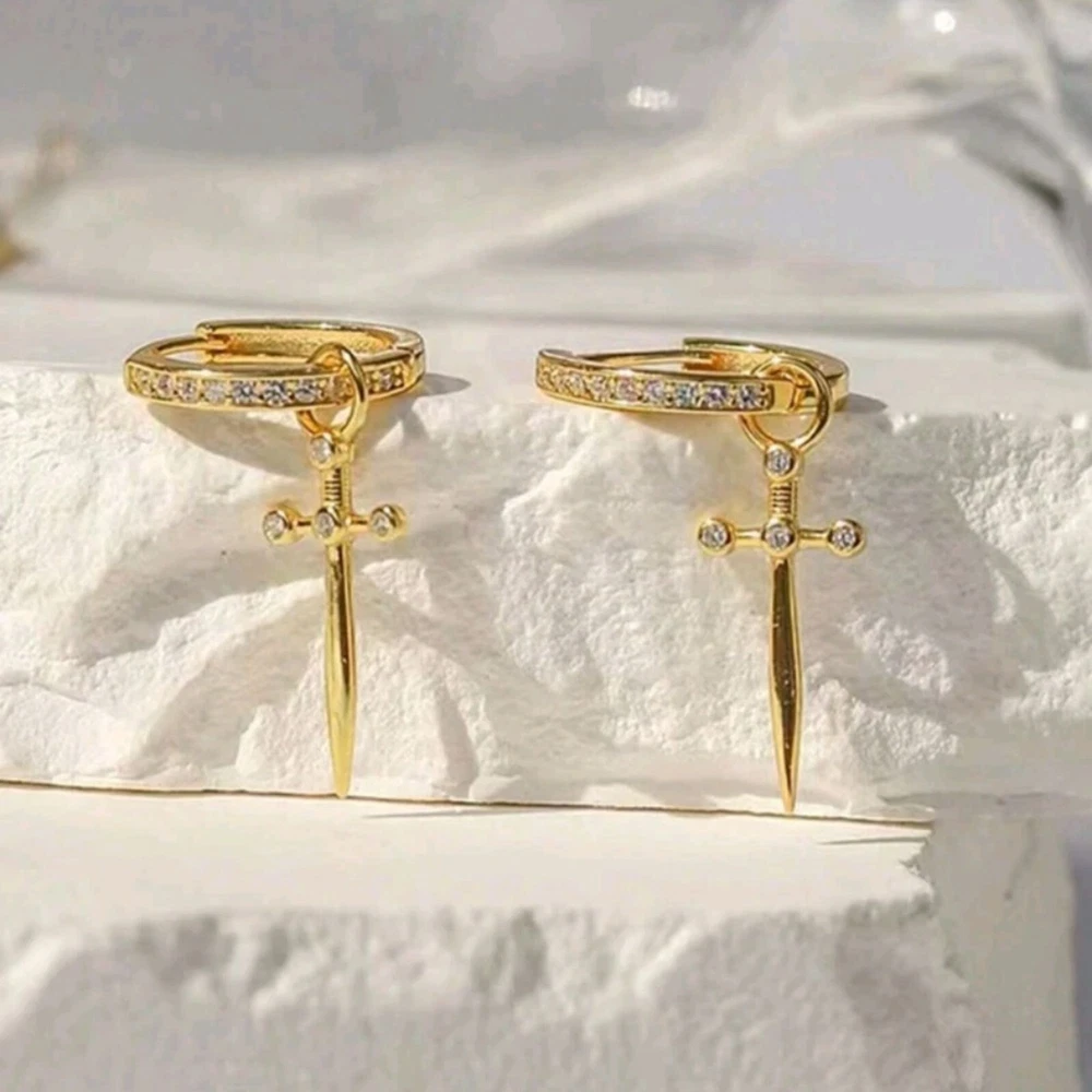 Add a touch of daring elegance to your look with these 18k Gold Plated Dagger Earrings. Each earring features a sleek, dagger-inspired design, sparkling with carefully set cubic zirconia stones that catch the light at every angle. Perfect for those who love to mix a bit of edge with their glamour, these earrings are lightweight and comfortable for all-day wear. Whether you're heading to a chic party or simply want to elevate your everyday style, these dagger earrings will make a bold statement. Own a piece of jewelry that's as fierce and unique as you are—limited stock, grab yours now!