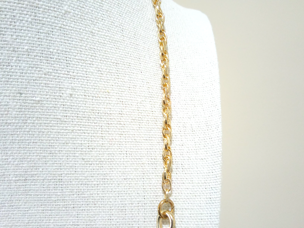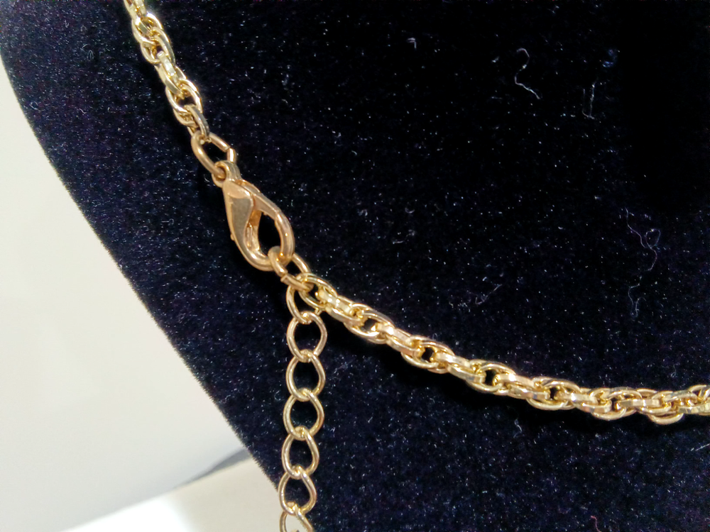 This is a unique piece. It is gold tone and has a 9" drop with a 2" extender. The fringe varies from 1" to 1 3/4". It has a very sturdy chain with a lobster closure.