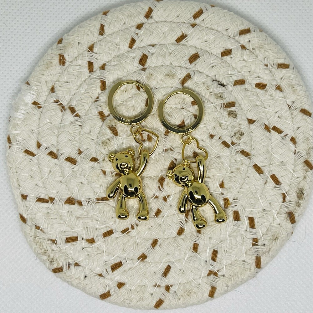 These 18k Gold plated hoop earrings with a dangling teddy bear heart charm are a playful and charming accessory. The earrings feature a classic, polished gold hoop design, which serves as a subtle and elegant base. Hanging from each hoop is a small, adorable teddy bear charm, crafted with attention to detail. The teddy bear holds a heart, adding a sweet and whimsical touch. The combination of the warm gold and the playful charm gives the earrings a youthful, yet refined look, making them a fun and unique piece of jewelry suitable for both casual and dressy occasions. #GoldHoopEarrings #TeddyBearCharm #HeartCharm #CuteEarrings #PlayfulJewelry #SweetStyle #WhimsicalAccessories #GoldJewelry #AdorableEarrings #FashionDetails #CharmJewelry