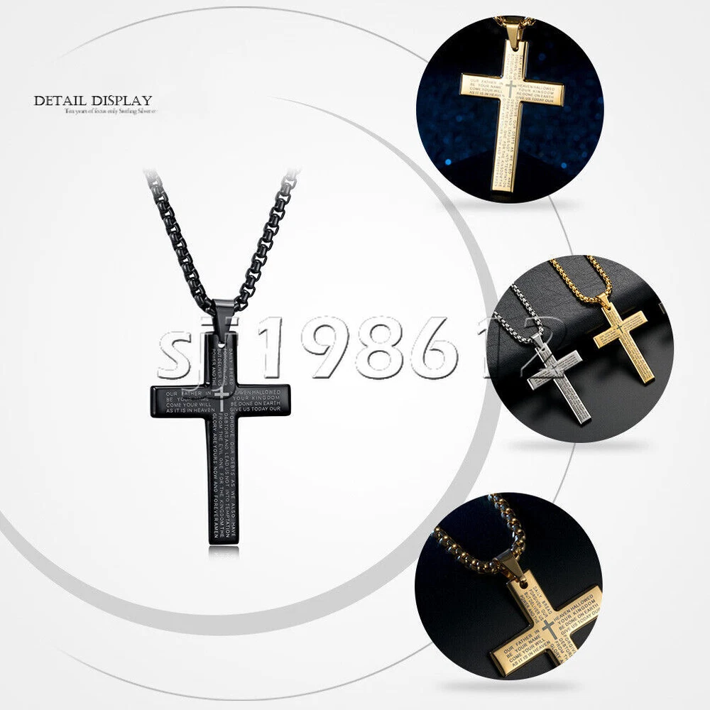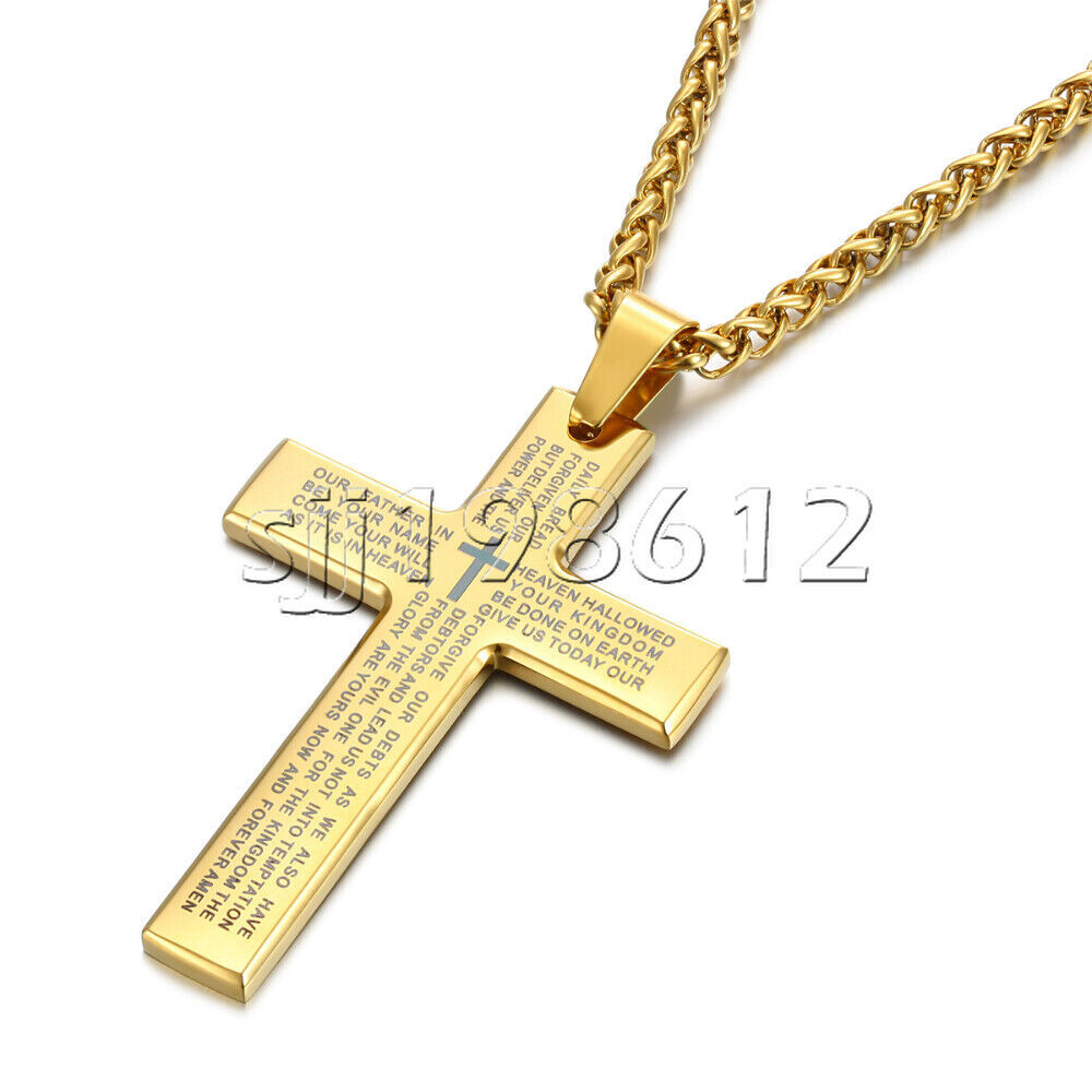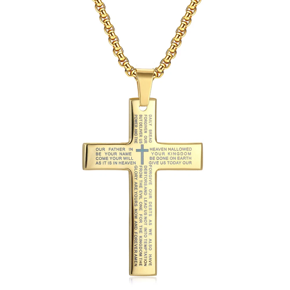 Gold-Plated Stainless Steel Men's Cross Necklace with Lords Prayer Bible Pendant Chain