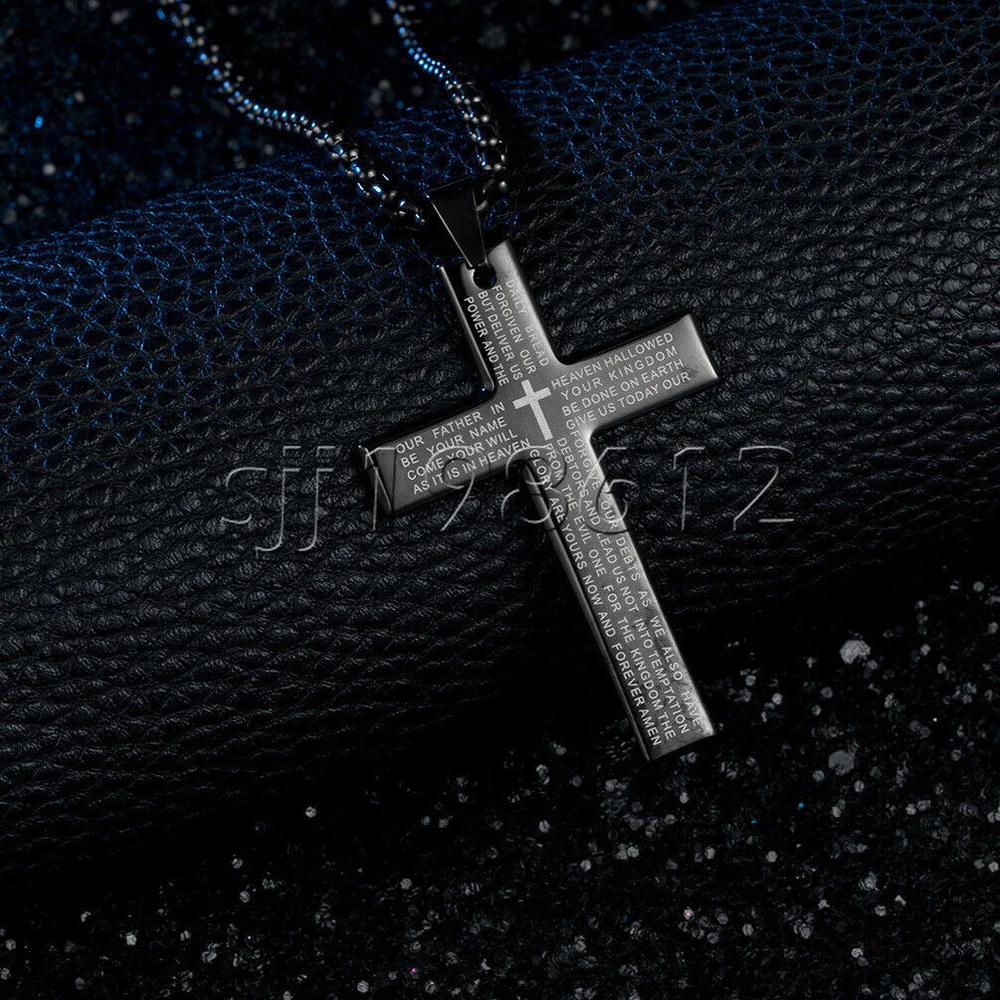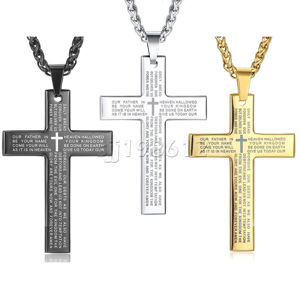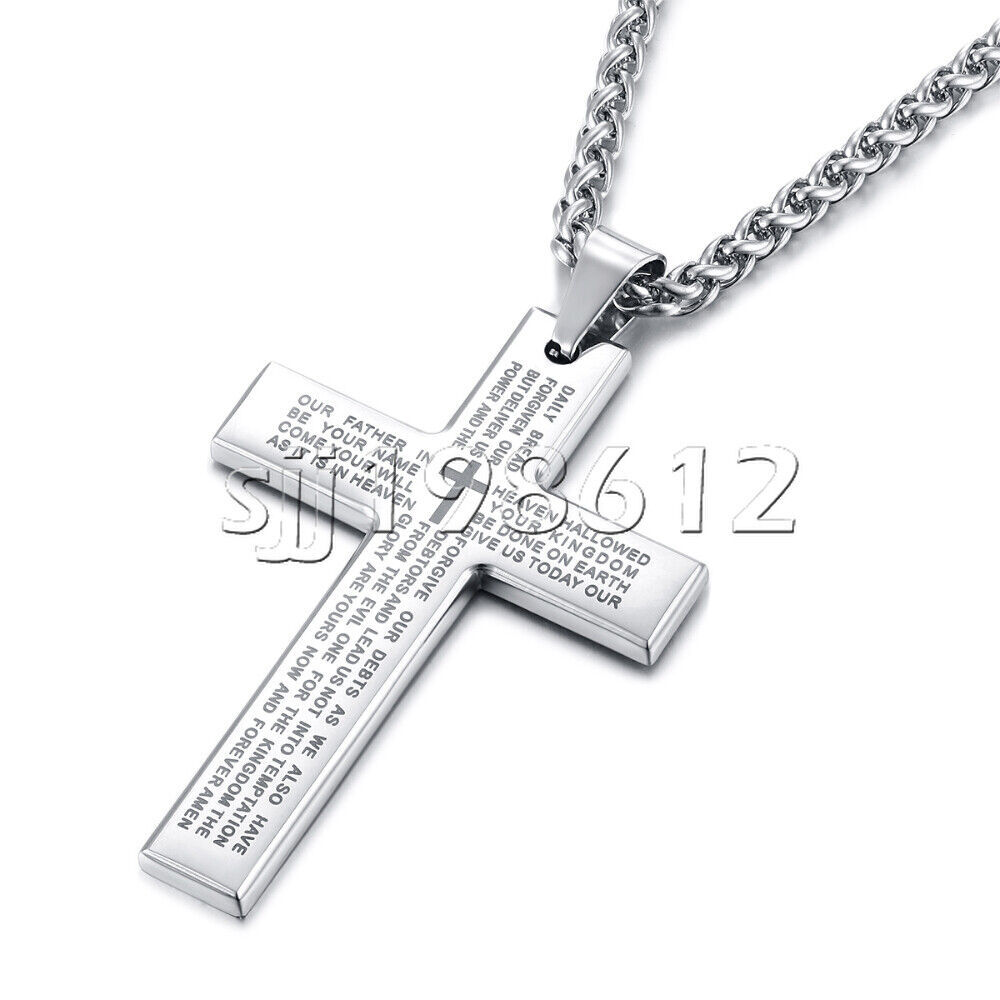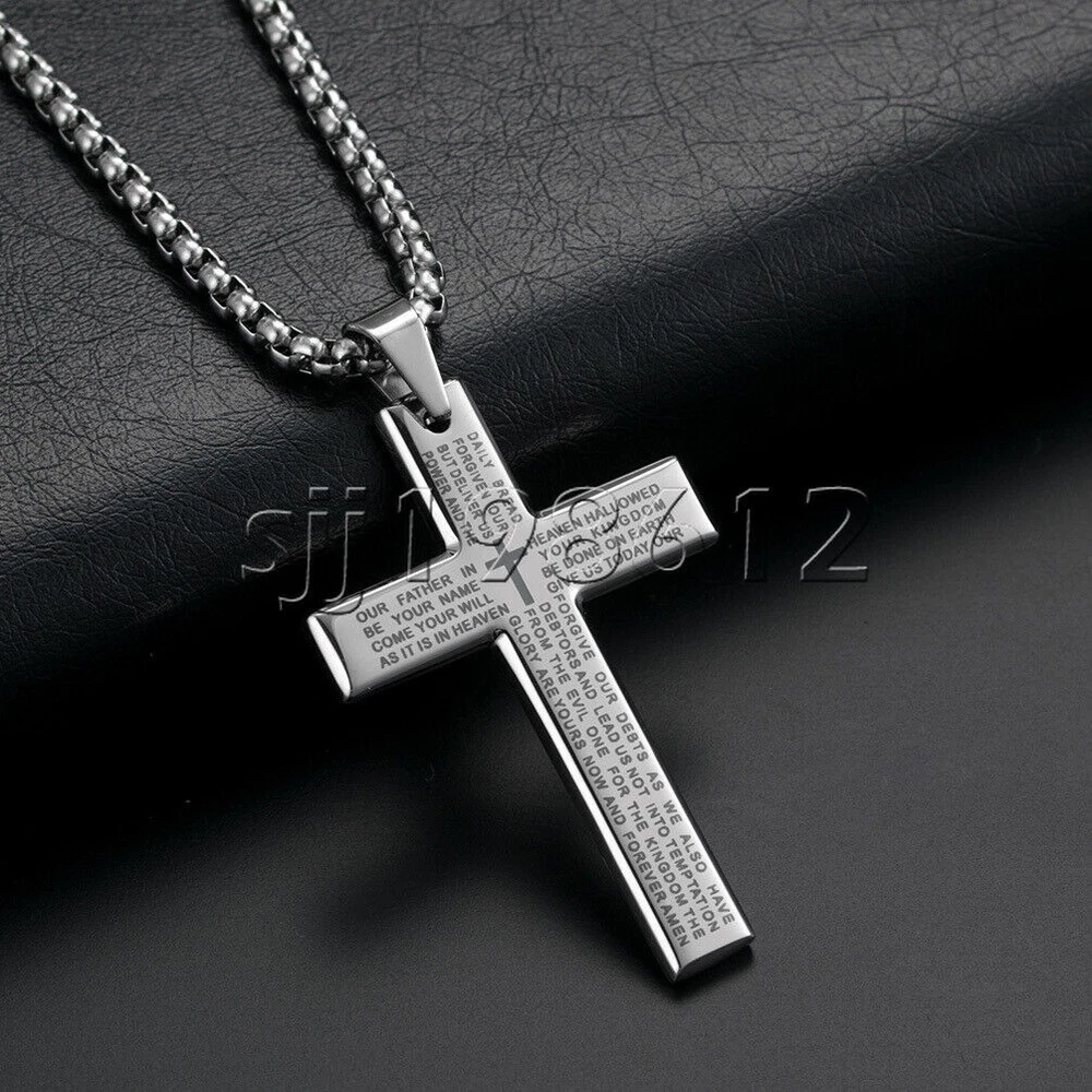 Gold-Plated Stainless Steel Men's Cross Necklace with Lords Prayer Bible Pendant Chain
