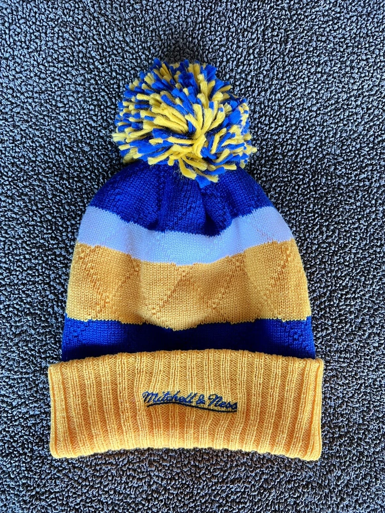 Golden State Warriors Mitchell & Ness Hat With Pom - Unisex Adult - Blue & Yellow. New. Never worn.