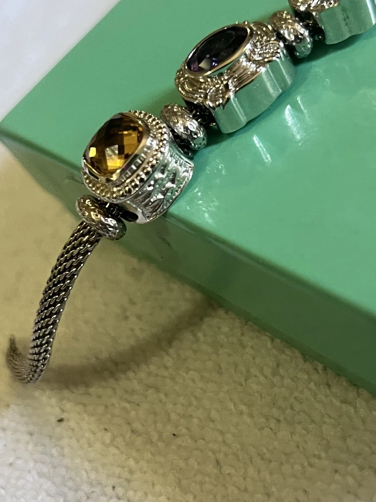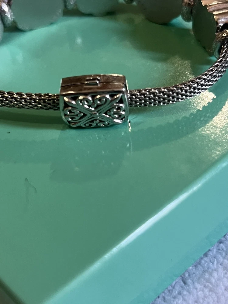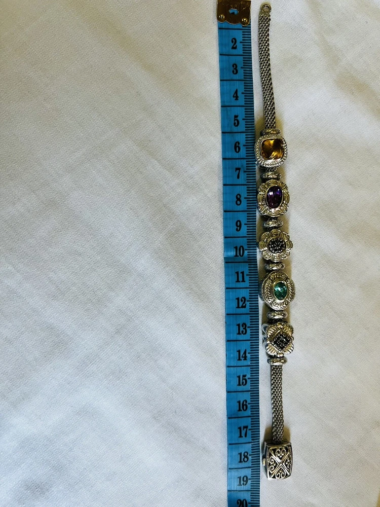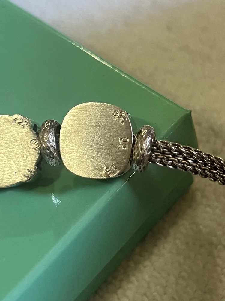 This stunning Goldman Kolber bracelet is a must-have for any jewelry collection. Crafted with excellent cut grade and a mesh chain type, this bracelet is both stylish and comfortable to wear. Its charm style and dividers make it a perfect accessory for any occasion. Included in the purchase are 5 slides charms and 6 dividers, adding a unique touch to the already gorgeous bracelet. Whether you're dressing up for a special event or adding a touch of elegance to your everyday look, this bracelet is sure to impress. Don't miss out on the opportunity to own this exquisite piece of fine jewelry. This item in excellent condition . Pictures are part of description. Over $1000 value for all most half price. The bracelet is bit over 7 inches long .