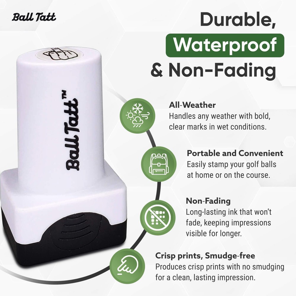 - Finger Golf Ball Stamp, Golf Ball Stamper, Self-Inking Golf Ball Stamp Markers, Reusable Golf Ball Marking Tool to Identify Golf Balls, Golfer Gift Golfing Accessories… BIGGER, WIDER, EASIER TO SPOT: Up to 50% larger & easier to recognize than most golf ball stamps! 0.75'' x 0.5'' golf ball stamper pad imprints BIG permanent impressions for fast & easy ball identification. SELF-INKING, NO MESS, NO FUSS: Our golf ball marker stamps are pre-loaded with enough ink to last the season & don’t ever need to be refilled or fussed with. No spills. No leaks. Use at home or at the course. QUICK-DRYING PERMANENT INK: Stamp golf balls & swing in seconds! Fast-drying, waterproof & fade resistant, our quick dry stamping ink is less prone to smudging & made to outlast the life of your golf ball. LOTS OF UNIQUE STAMP MOTIFS: stampers come in a wide range of creative designs and styles, you'll be sure to find one that fits you to a tee! GREAT GIFT IDEAS FOR GOLFERS: Self-inking golf ball markers are top golf gifts on every golfer’s wish list. The perfect golf gift for the golfer in your life. PORTABLE FOR CONVENIENCE More convenient than golf ball engraving, golf ball tats can be applied on or off the course. Unlike a golf ball engraver, self inking golf ball stampers allow you to quickly mark balls on the go. Customize golf balls in a JIFFY! No delay whatsoever. Stamp & tee off right away. Fast-dry ink for the win. NO INK LEAKS OR REFILLING Carrying a leaky ink bottle for refills just isn't practical. Which is why we've made DIY golf ball stamps self-inking. Preloaded to deliver even applications for optimal precision, self-inking golf ball stamps couldn't be easier to use. Outfitted with airtight caps to prevent drying, they're foolproof. UNIQUE DESIGNS IN 4 COLORS Choose from a wide variety of unique mottos, funny sayings, trendy symbols & more in blue, black, green or red. golf ball stamper markers are available in a range of humorous, patriotic, quirky, eccentric & distinctive styles. Never again confuse your balls for another's. Find & spot golf balls like a hawk. Weekend golfers & professional linksmen alike count on to personalize golf balls. The long lasting high performance golf ball stamps you can trust, our golf ball stamper markers make excellent golfing gifts for men & women golfers. Give stamps as golfer stocking stuffers, golfing retirement gifts & more. Shipping We offer FREE shipping on all orders! We ship within Three business days of payment, usually sooner. We use a selection of shipping services such as UPS, FedEx, USPS etc. We only ship to the lower 48 states, no APO/FPO addresses or PO Boxes allowed. Local pickups and combined shipping options are not provided at this time. Return You can return a product for up to 30 days from the date you purchased it. Any product you return must be in the same condition you received it and in the original packaging. Please keep the receipt. Payment We accept payment by any of the following methods: PayPal Please pay as soon as possible after winning an auction, as that will allow us to post your item to you sooner! Feedback Customer satisfaction is very important to us. If you have any problem with your order, please contact us and we will do our best to make you satisfied. Contact Us If you have any queries, please contact us via ebay. We usually respond within 24 hours on weekdays. Please visit our eBay store to check out other items for sale! Thank you for shopping at our store.