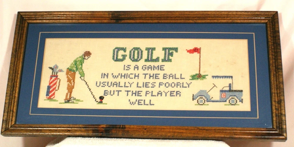 Enhance your golf-themed decor with this beautifully designed cross stitch framed artwork. The multi-colored needlework depicts a golfer in action, with a vintage quote adding a touch of class. It's perfect for any golf enthusiast and would look great in a home or office setting. This product is specifically designed for fans of the sport, adding a unique touch to your collection of golf-themed decor. The high-quality framing ensures the artwork is protected and can be displayed for years to come. Don't miss out on this opportunity to own a piece of exquisite golfing art.