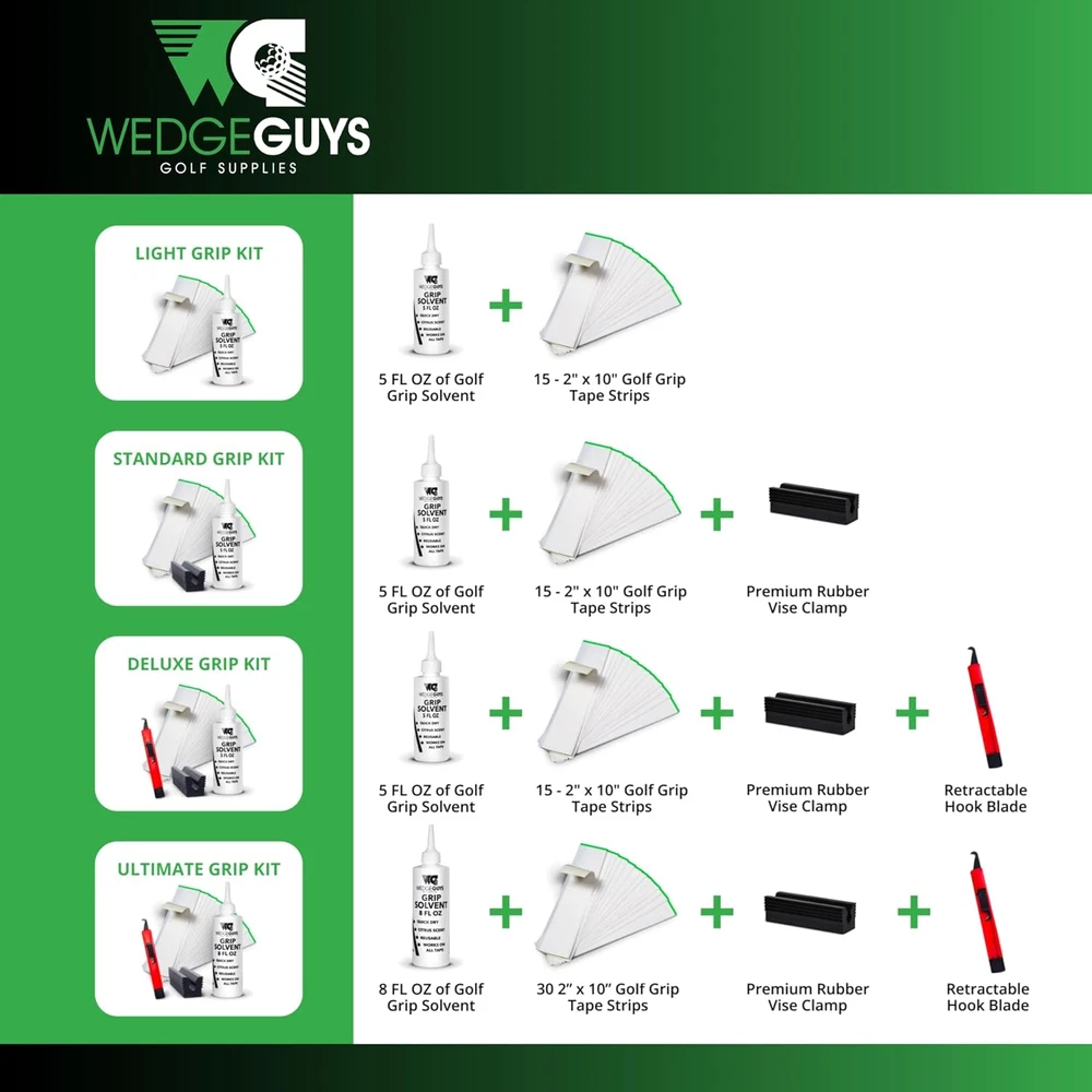 DELUXE GOLF REGRIPPING KIT: Professional quality and contains everything you need to easily regrip up to 15 golf clubs from the comfort of your own home. RETRACTABLE HOOK BLADE: Made of High Strength Carbon Steel, Wedge Guys Golf Grip Remover has been tested to last well over 100 grips removed. GOLF GRIP TAPE STRIPS – The Wedge Guys Regripping Golf Club Kit includes 15 2” x 10” premium double sided adhesive golf club grip tape tape strips that are easy-to-peel and won’t bunch up during installation. GRIP SOLVENT – The high quality Grip Solvent included in the Wedge Guys Golf Club Grip Kit comes in a 5 oz bottle with squirt spout and is non-flammable, non-toxic, citrus scent and works on all tape RUBBER VISE CLAMP – Made of thick durable rubber, the included 3 ½” rubber vise clamp features shoulder grip wedges to prevent slippage while your club is in the vise and can be used for all your golf repair needs. ***We offer 6 different types of kits, please make sure you select the correct one*** Save Money and Time with the Professional Quality Golf Grip Kit by Wedge Guys Never miss a match again due to faulty products and cheaply made golfing grip kits. The Wedge Guys golf grip kit includes everything you need to regrip your golf clubs and is Made in the USA to ensure consistent quality every time. Whether or not you've regripped clubs in the past this all-in-one kit will ensure you have everything you need to easily regrip your golf clubs, including clear step-by-step instructions and the highest quality regripping products available.