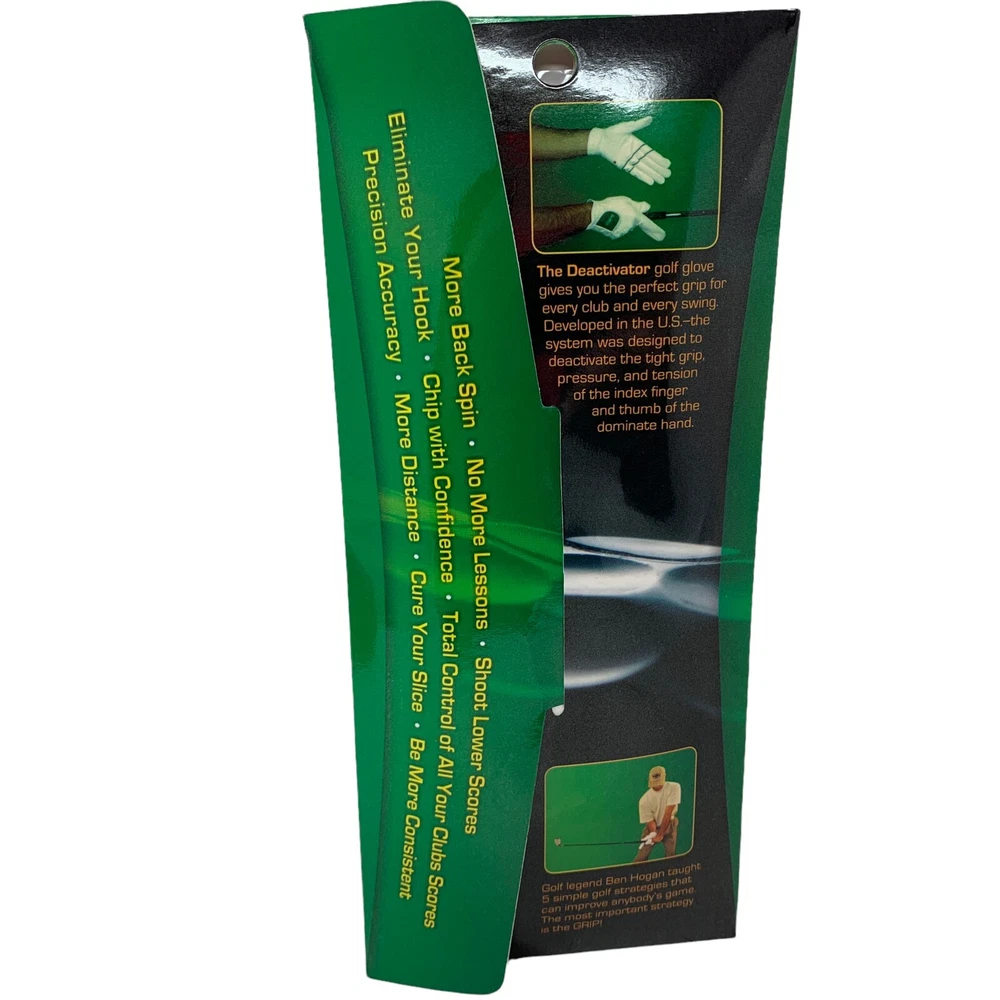 The Deactivator by SwingMagic is a pair of white golf gloves made with built in grip guides and buffers. The trail hand Deactivator glove is designed with formed plastic brace in the index finger to keep it straight and a pad on the thumb to eliminate the tight grip pressure created when you squeeze the index finger and thumb too tightly on the grip during the swing. The printed guides on the lead hand glove show you how to properly grip the club to deliver a square clubface on impact. By using The Deactivator you will activate the correct arm and hand muscles in the golf swing, allowing you to spend more time concentrating on things like managing the course and what type of shot you are going to hit instead of how you are going to make it happen! MEASUREMENTS: Measure from top of middle finger to wrist S - 7.25 inches M - 7.5 inches L - 8 inches XL - 8.5 inches WHAT MAKES THE DEACTIVATOR DIFFERENT? The Deactivator is an amazing golf swing training aid designed to help hit the ball higher, straighter and farther more often. The Deactivator will help you quickly improve by giving you a neutral perfect grip and allowing you to feel the proper grip pressure needed to have a consistent swing. The Deactivator will train you to deactivate unwanted muscle tension in the golf swing. The Deactivator will soften your grip pressure so your hands can release properly through impact. The Deactivator's built in alignment guides keep your lead arm and club in line creating a more solid strike with your arms and hands leading the club thru impact. The Deactivator is perfect for beginners or experienced players. The Deactivator will help you cure your hook or slice in minutes.