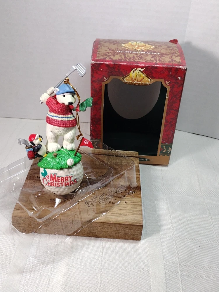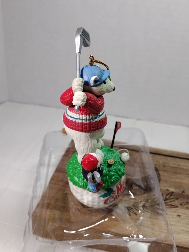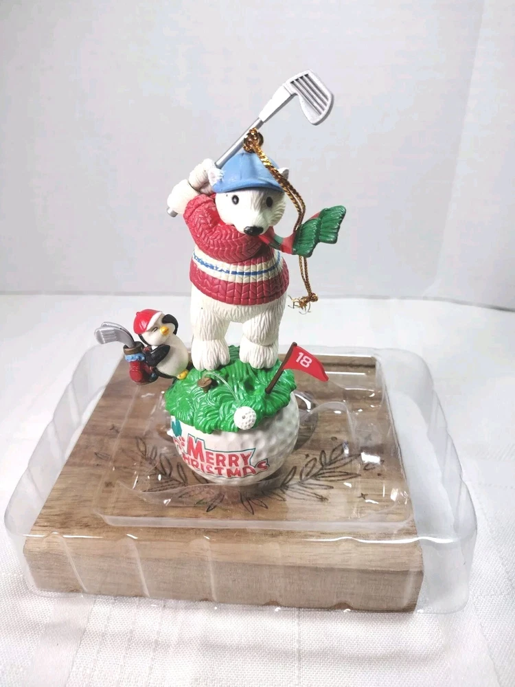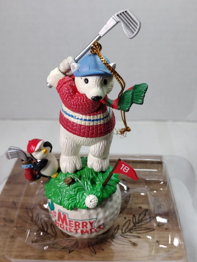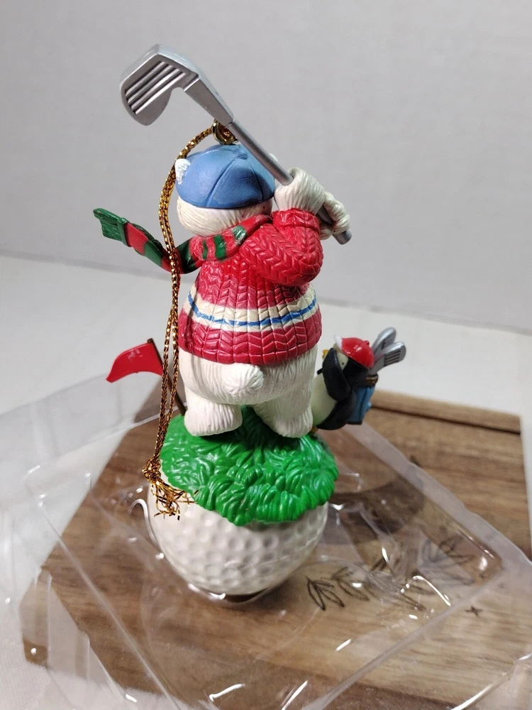 Adorable vintage Christmas tree ornament polar bear and penguin friends golfing together pre-owned but in good condition no cracks no chips