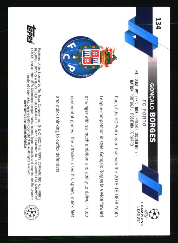 Set: 2022-23 Topps UEFA Club Competitions 1st Edition Team: FC Porto Autographed: No Graded: No Manufacturer: Topps Sport: SOCCER Season: 2022 Type: Sports Trading Card Year Manufactured: 2022 Player|Athlete: Gonçalo Borges Card Number: 134